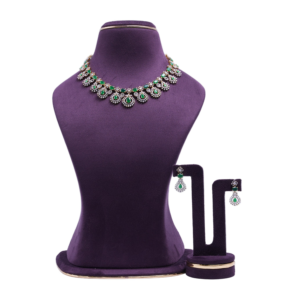 The Regal Emerald Bloom Necklace Set is a masterpiece of grandeur and elegance. Designed with vibrant green stones encircled by dazzling white accents, the necklace showcases a stunning floral-inspired arrangement. Each element radiates timeless beauty, making it the perfect centerpiece for weddings, festive occasions, and royal celebrations. Its balanced blend of luxury and comfort ensures you shine with unmatched sophistication.