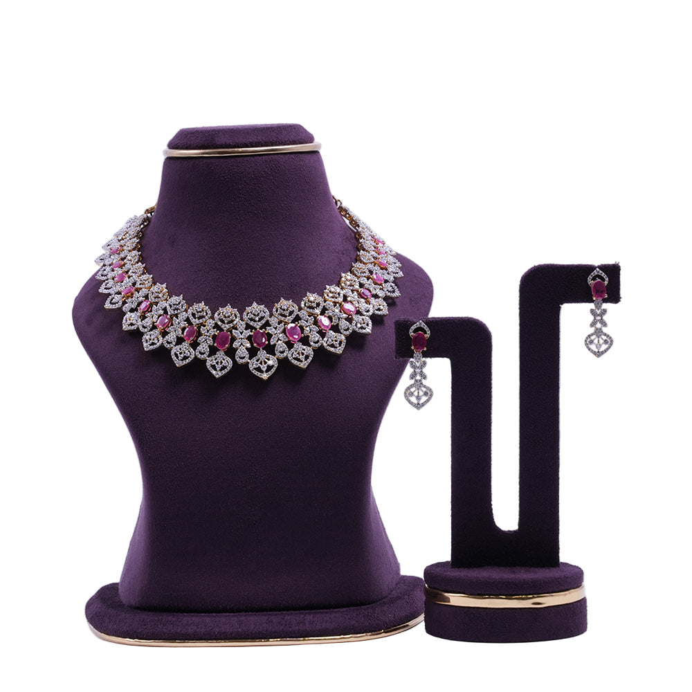 The Ruby Radiance Regal Necklace Set is a striking piece of jewelry designed to bring out your inner royalty. Adorned with deep ruby-red stones surrounded by dazzling white crystals in an intricate floral design, this choker-style necklace exudes elegance and grandeur. Perfect for weddings, festive occasions, and grand celebrations, it adds a bold yet refined statement to your look.