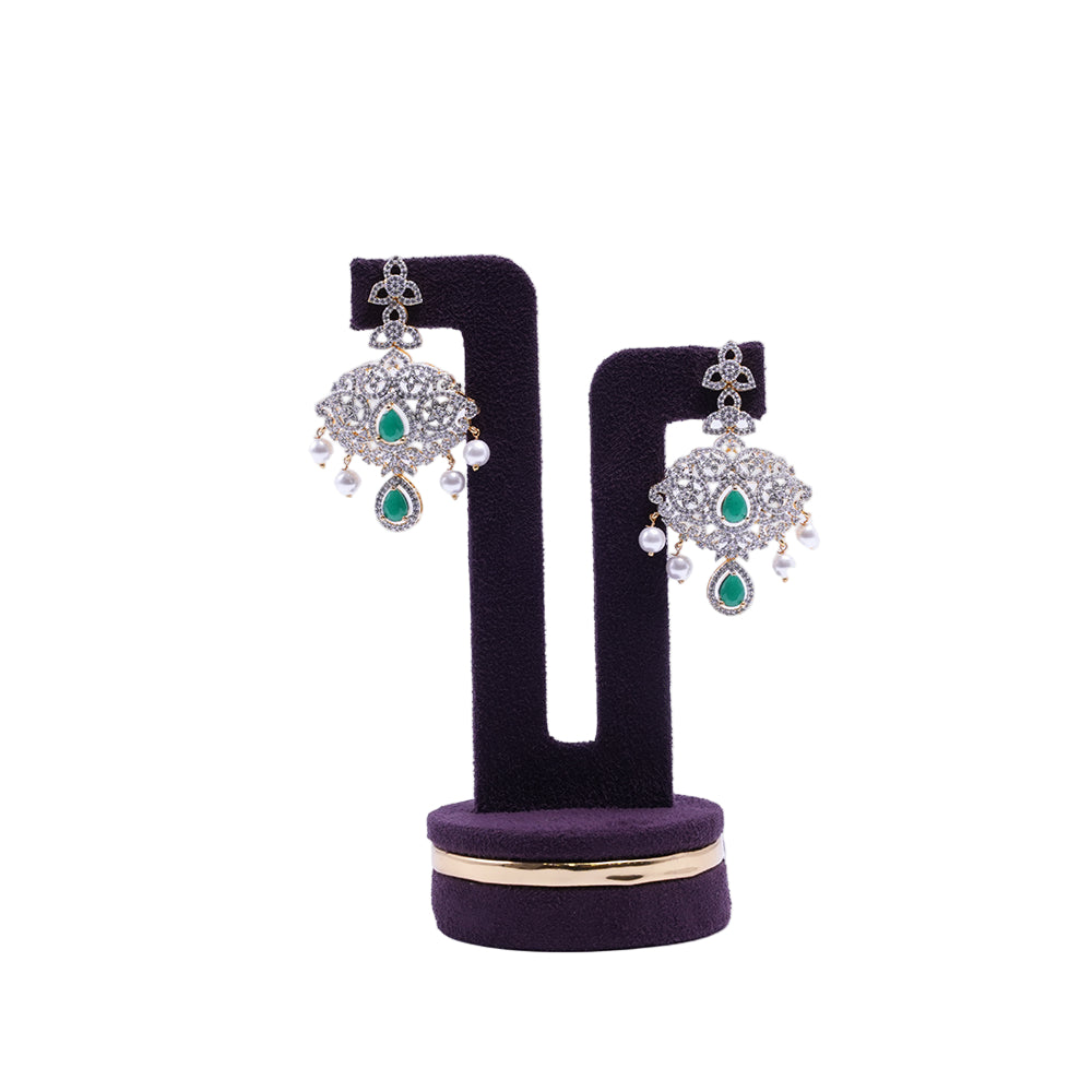 The Emerald Royale Heritage Chandbali Earrings are crafted to mirror the grandeur of the necklace set. Featuring emerald-green stones paired with dazzling white accents and pearl hangings, these earrings perfectly blend tradition with elegance. Whether worn with the necklace set or styled independently, they add a touch of sophistication and charm to any outfit.