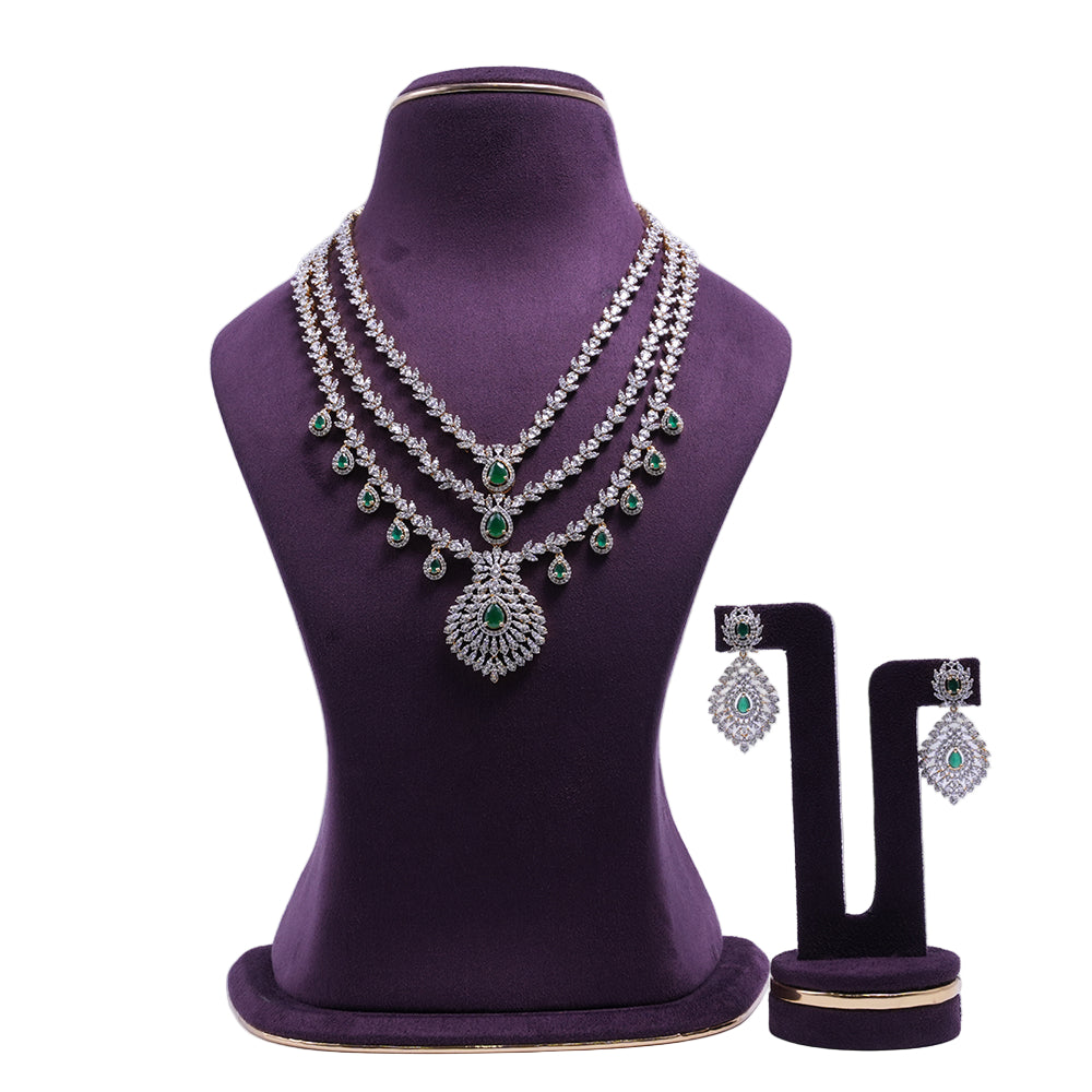 The Emerald Cascade Royale Necklace Set is a captivating creation that blends elegance with grandeur. Designed with three delicate layers of sparkling white crystals, each adorned with striking emerald-green teardrop stones, this masterpiece radiates timeless charm. The intricately detailed pendant and matching danglers elevate its regal allure, making it an ideal choice for weddings, festive occasions, and traditional celebrations.