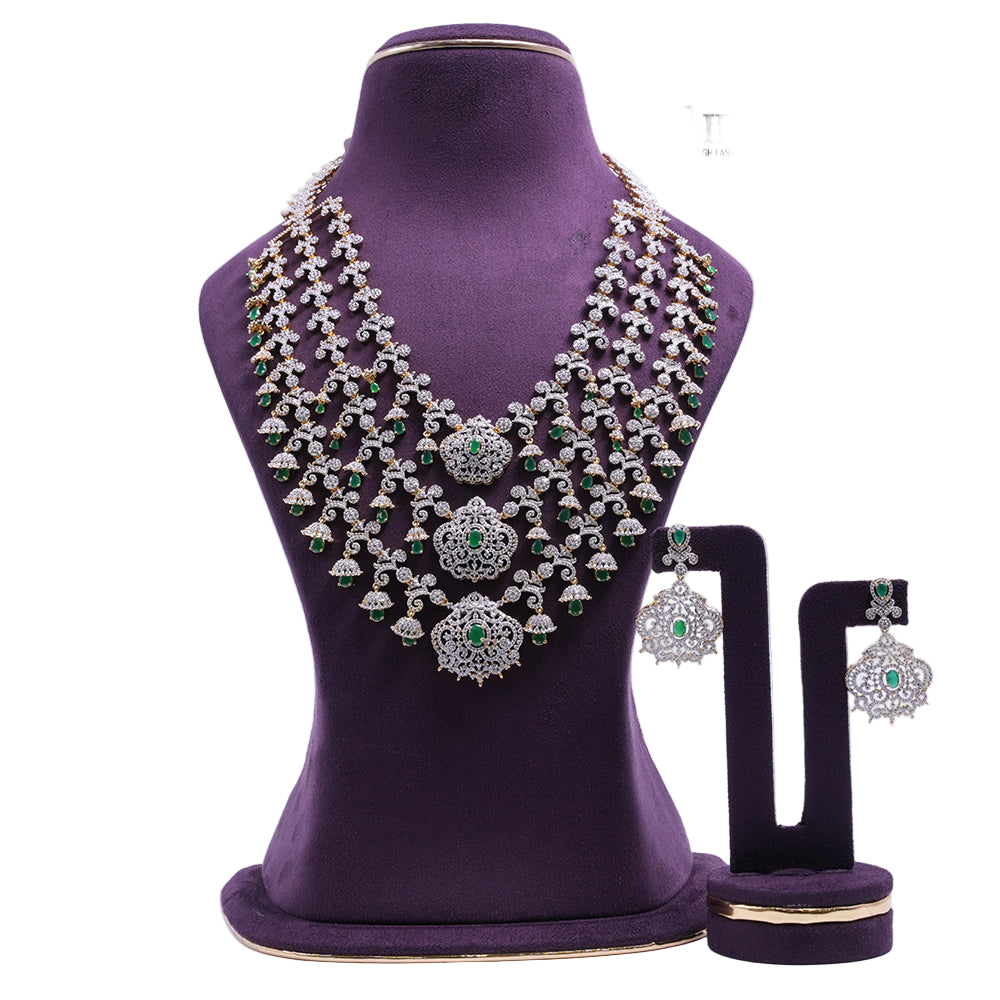 The Emerald Majesty Royale Necklace Set is a breathtaking creation that redefines grandeur with its layered, chandelier-inspired design. Adorned with dazzling white stones and radiant green emerald accents, this masterpiece exudes unmatched regality. Its intricate patterns, paired with hanging embellishments, add a touch of opulence, making it a perfect choice for weddings, traditional ceremonies, and festive occasions.