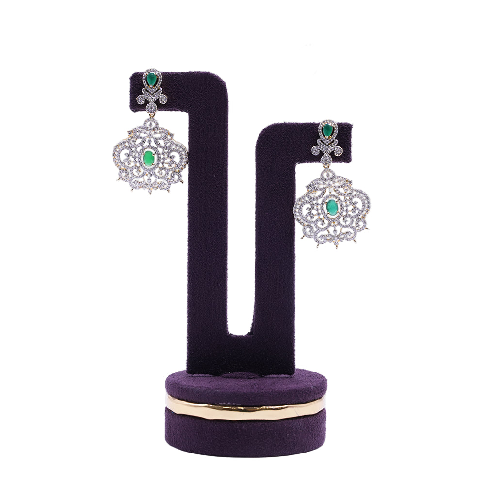 The Emerald Majesty Royale Earrings are designed to mirror the grandeur of the necklace set. Featuring oval emerald stones encased in intricate, filigree-style stone-studded patterns, they bring a royal flair to any outfit. Whether paired with the necklace or worn alone, these earrings elevate your festive and traditional attire with timeless charm.