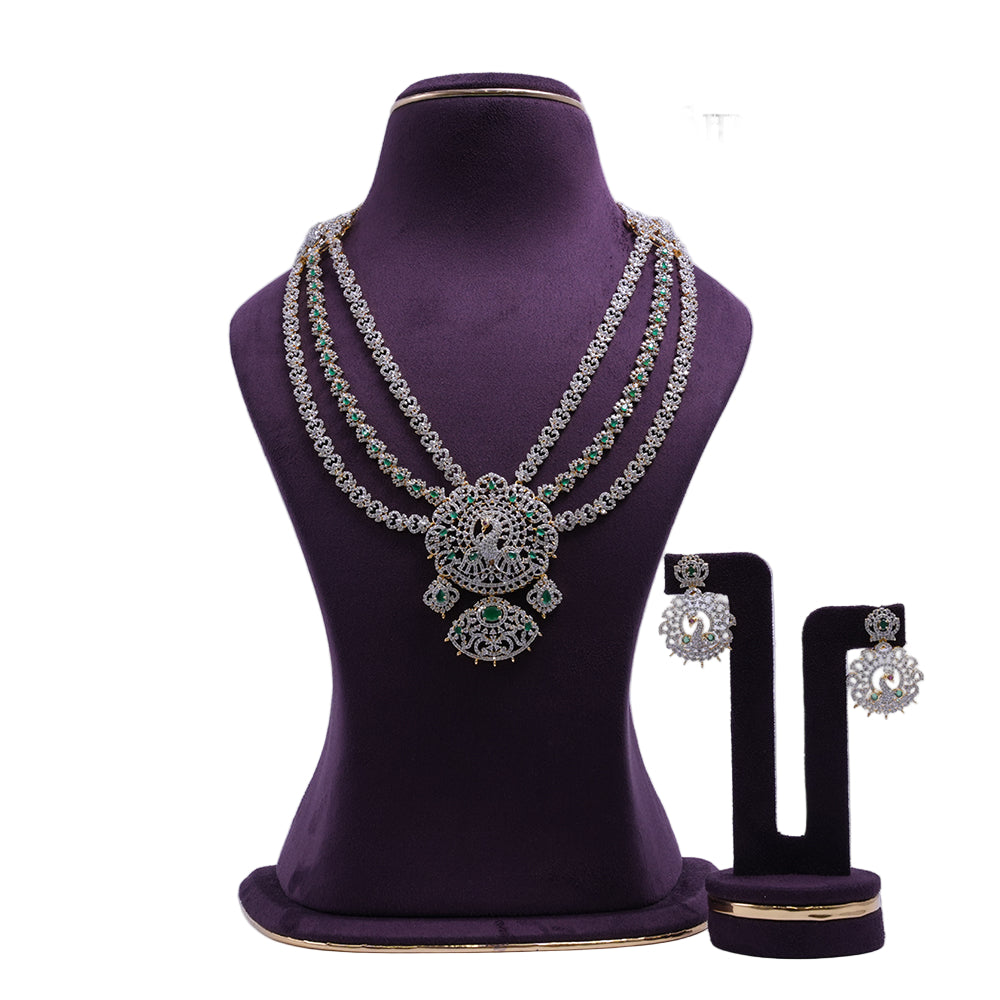 The Regal Peacock Grandeur Necklace Set is an enchanting display of artistry and grace. Featuring a triple-layered necklace adorned with sparkling white stones, emerald accents, and a grand central pendant showcasing intricate peacock motifs, this set radiates majestic charm. The delicate craftsmanship and royal design make it an exceptional choice for weddings, festive celebrations, and traditional occasions.