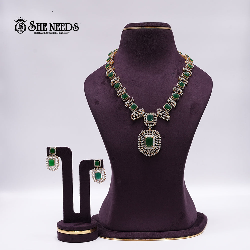 An opulent 1gm gold necklace set designed with bold green stones and stunning American diamond work. This royal piece is a perfect choice for brides and grand festive occasions.