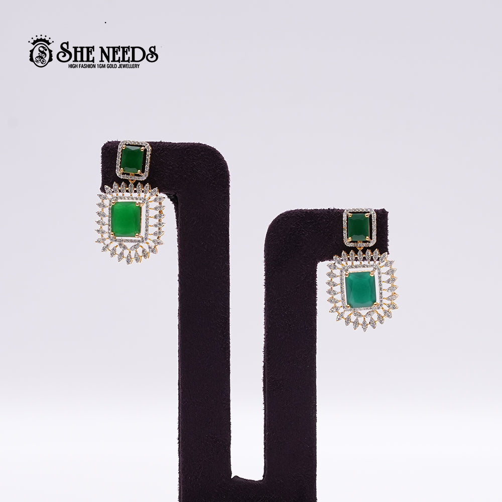 These exquisite earrings feature vibrant green stones framed with a crown of dazzling American diamonds, offering a regal look with modern grace.