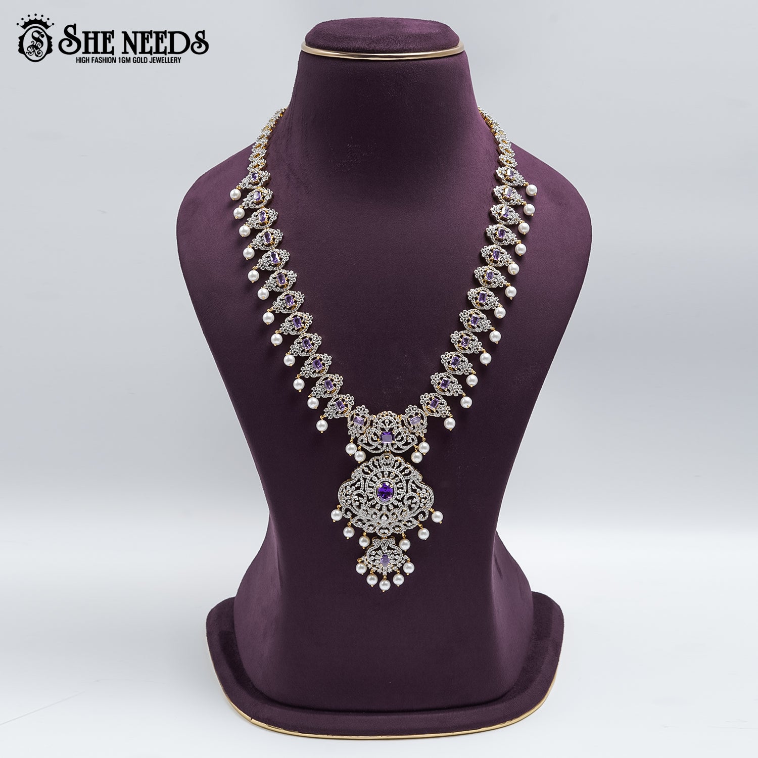 Elevate your style with the Amethyst Aura Kundan Pearl Necklace Set. This stunning piece features rows of radiant purple stones and shimmering white gems along the chain, finished with elegant pearl drops. The statement pendant is intricately designed with a central amethyst stone and detailed filigree, making it perfect for bridal, festive, or any special celebrations.