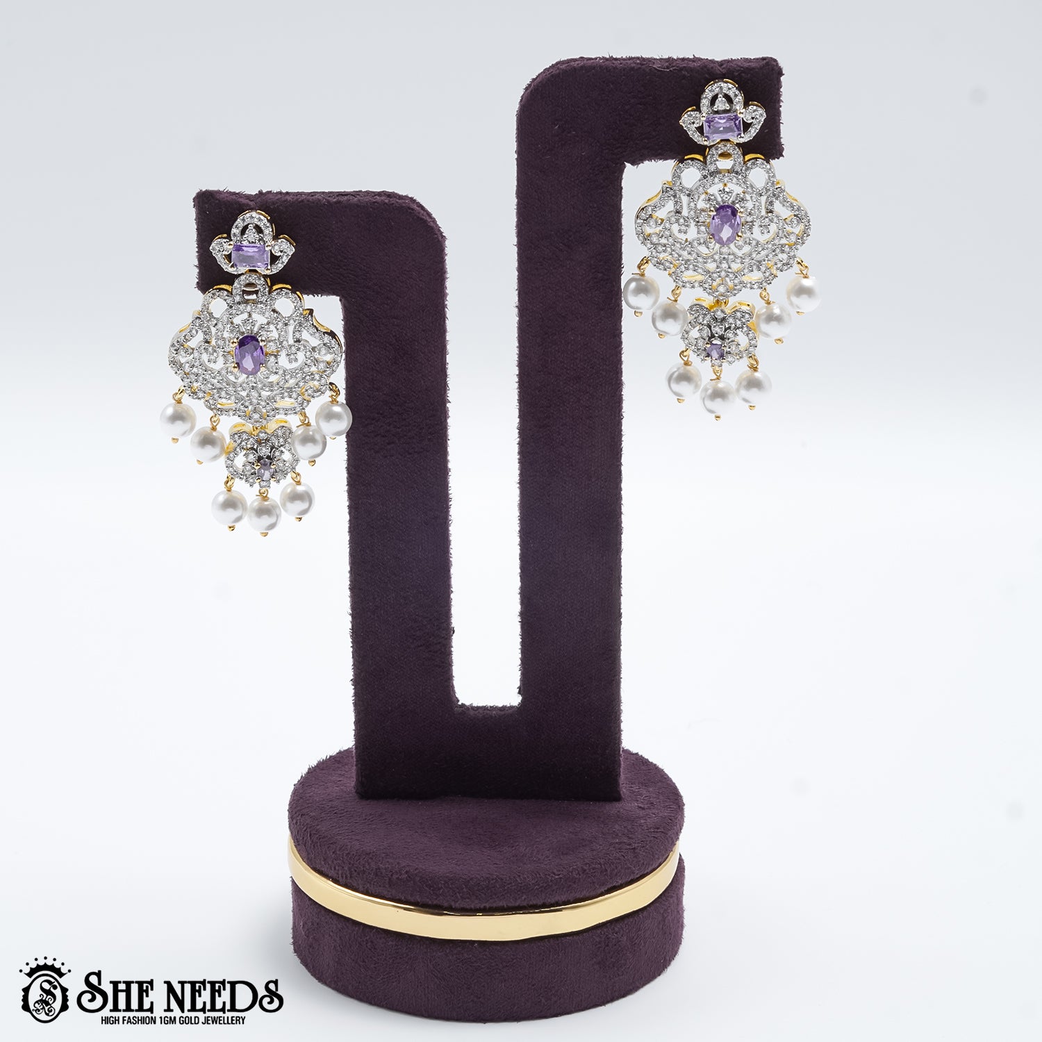 Add a touch of luxury to your outfit with these Amethyst Aura Kundan Drop Earrings. Crafted with lovely purple stones, sparkling white gems, and playful pearl drops, these earrings offer effortless elegance for any occasion, from weddings to festive events.