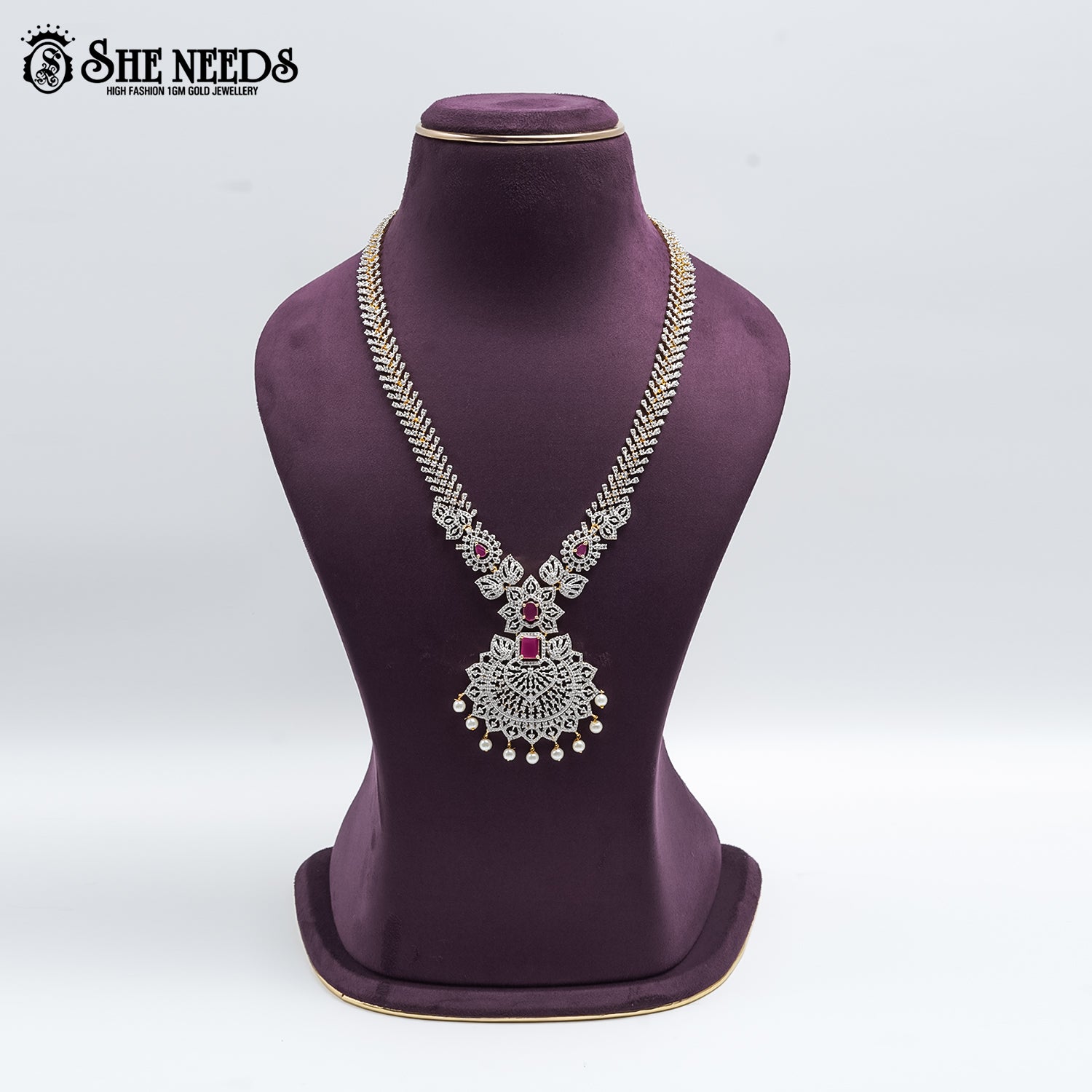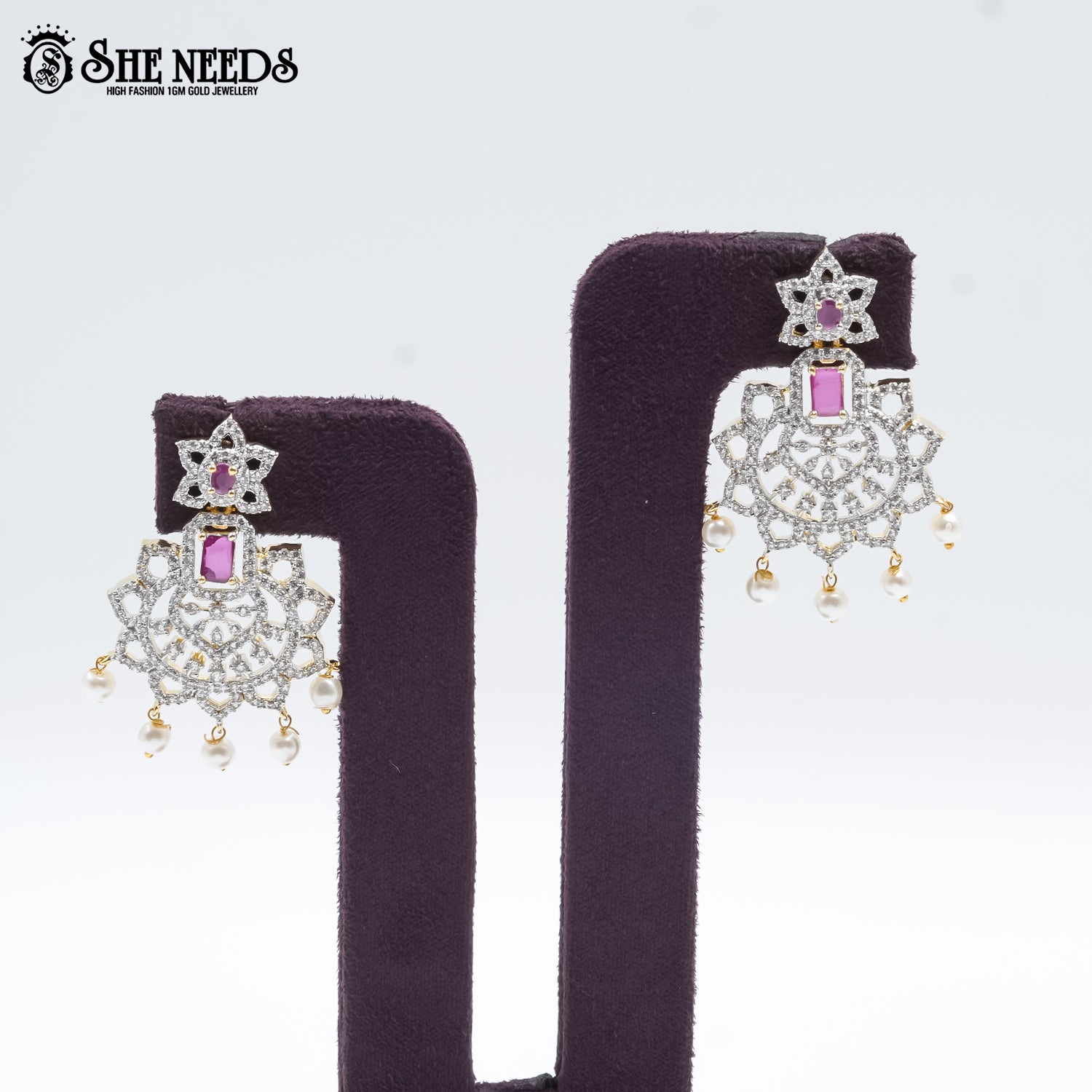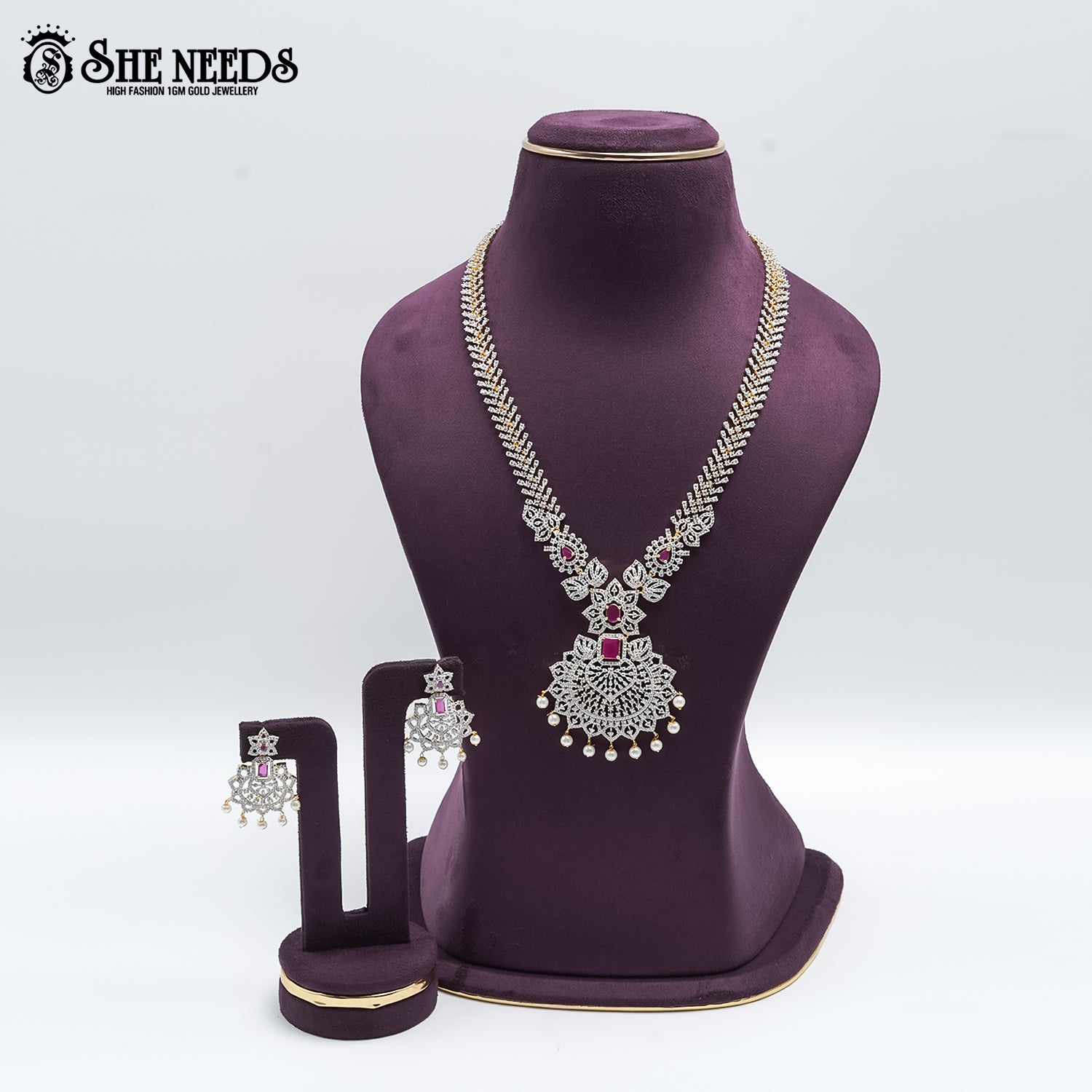 Exuding refined elegance, the Royal Radiance Necklace Set is designed for those who appreciate intricate detail and timeless luxury. The necklace features a symmetrical pattern adorned with dazzling white stones and radiant ruby-toned embellishments, culminating in a floral medallion centerpiece with pearl droplet accents. Perfect for weddings, engagements, or traditional festivities, this piece brings a majestic touch to any ethnic ensemble.