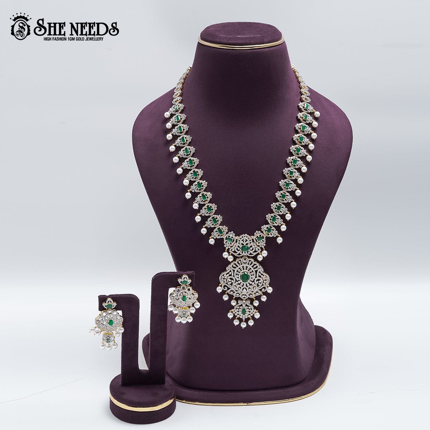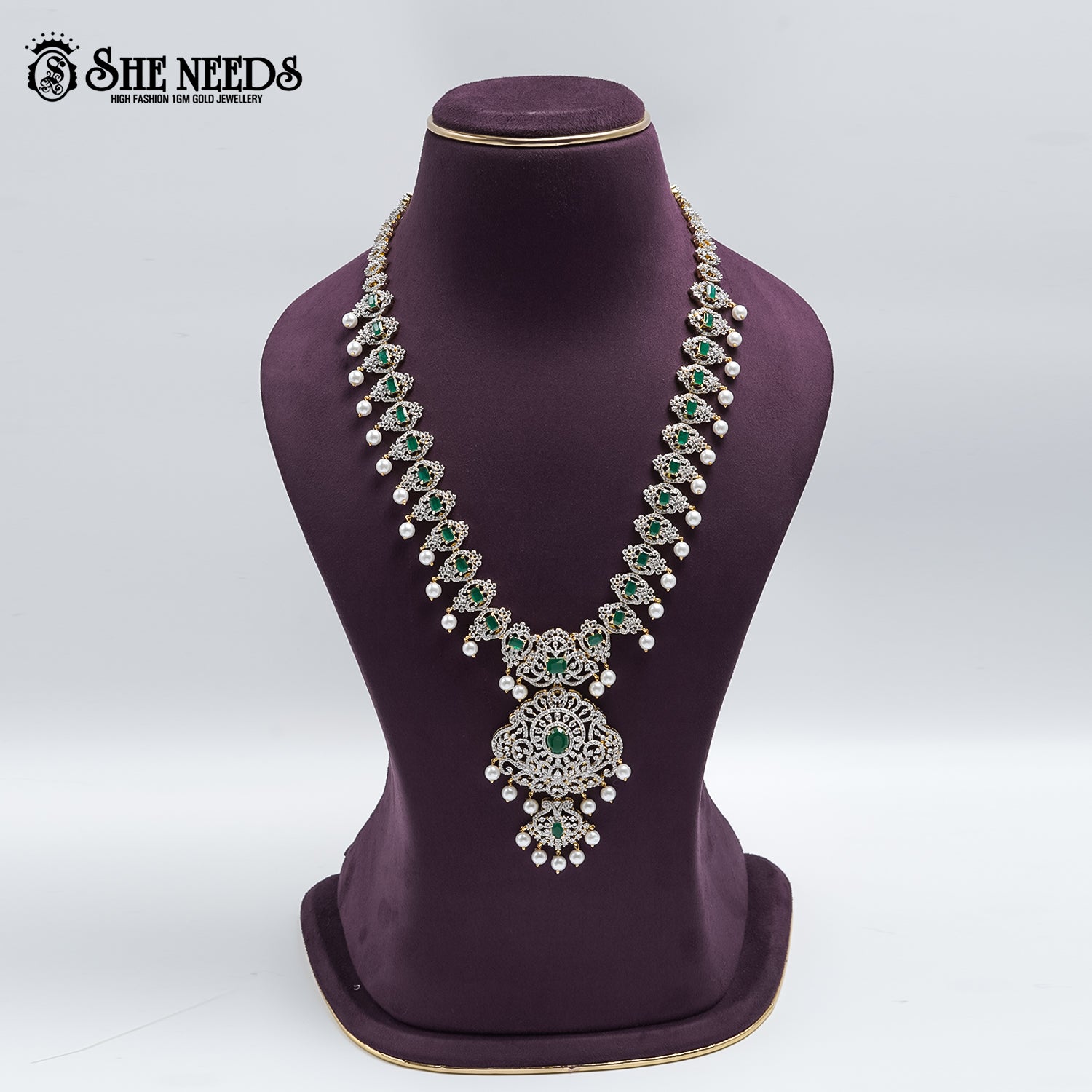 Step out in style with the Emerald Queen Kundan Pearl Necklace Set. This long and elegant necklace features vibrant green stones set among glittering white gems and classic pearls. The grand pendant, detailed with intricate work and a double-drop design, is sure to capture everyone’s attention. Ideal for weddings, festive nights, and special occasions.