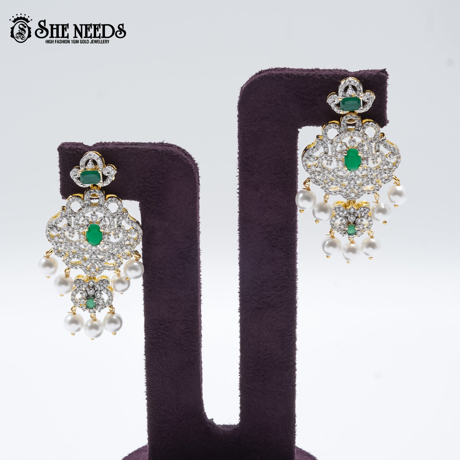 Brighten up any outfit with these Emerald Queen Kundan Drop Earrings. The rich green stones are beautifully set within sparkling white gems and finished with pearl drops for a timeless, royal touch. Lightweight and stylish, these earrings are the perfect finishing touch for any event.