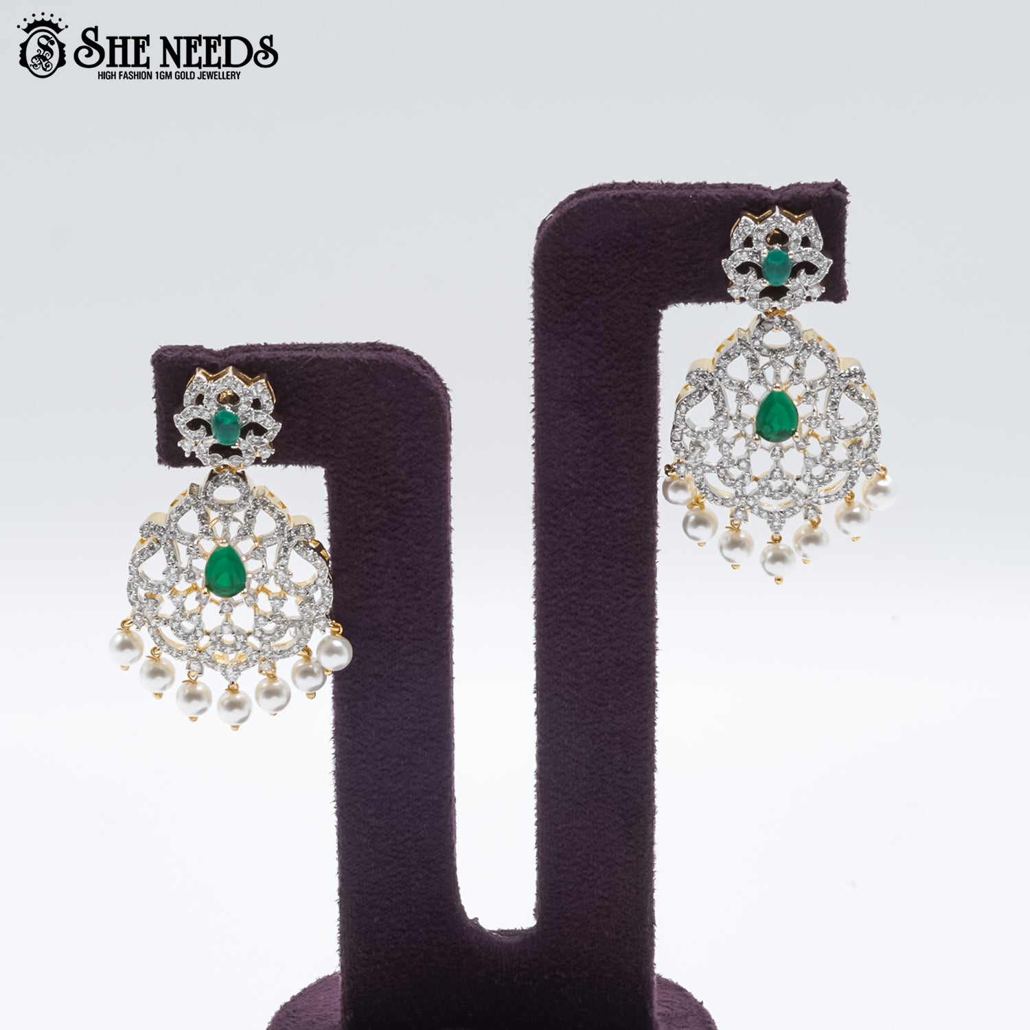 Grace your festive attire with the Ruby Radiance Diamond Pearl Drop Earrings. Featuring ruby accents surrounded by sparkling white stones and adorned with pearl hangings, these earrings are perfect for creating a statement. Lightweight yet elegant, they enhance both ethnic and modern outfits effortlessly.