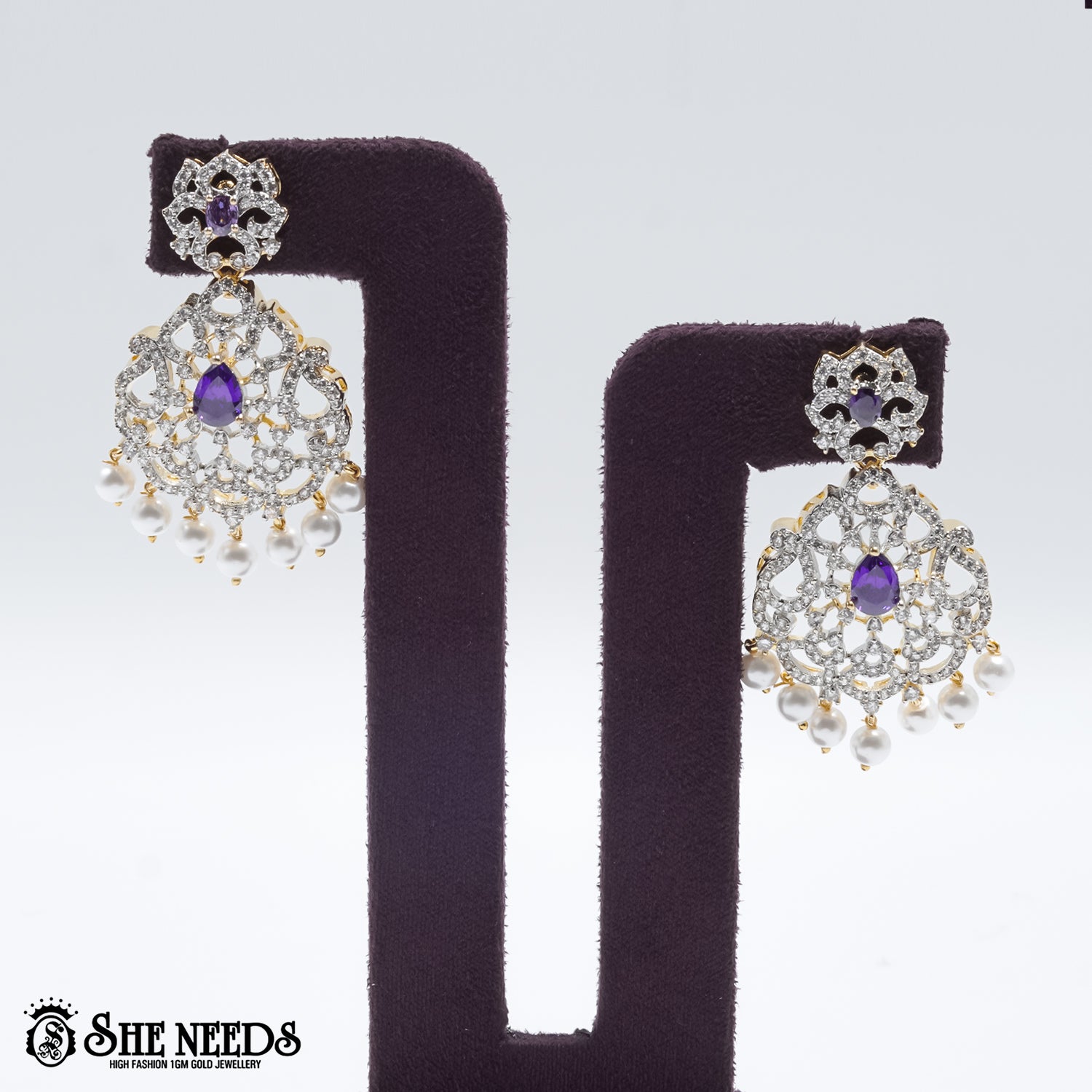 Enhance your traditional charm with the Amethyst Glow Diamond Pearl Drop Earrings. Designed with shimmering white stones and amethyst highlights, the earrings flaunt a lightweight floral lattice pattern, perfectly finished with graceful pearl drops. An ideal choice for weddings, festivities, and elegant occasions.