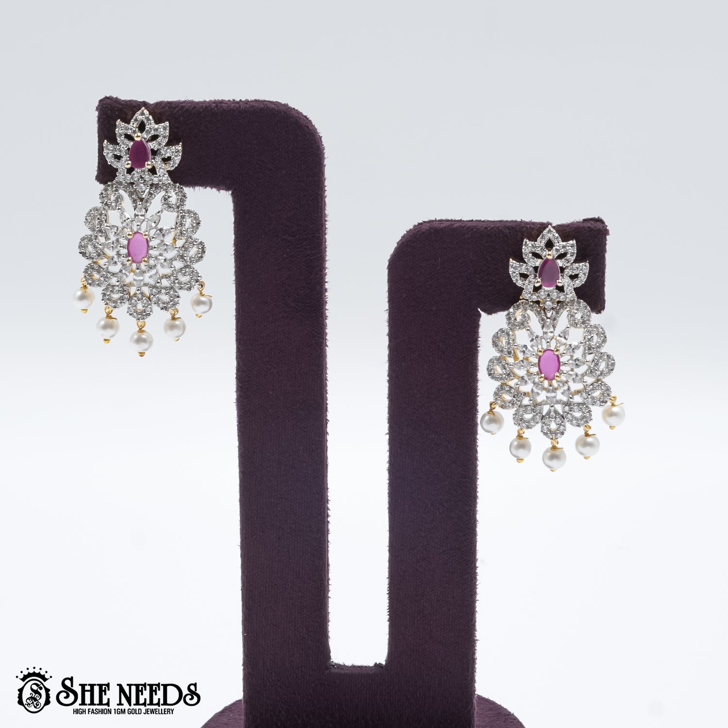 Complete your look with the Ruby Radiance Diamond Pearl Drop Earrings. Designed to pair flawlessly with the necklace set, these earrings feature ruby-inspired stones framed by white accents and elegant pearl drops. They offer a harmonious blend of tradition and glamour, perfect for bridal wear or festive celebrations.