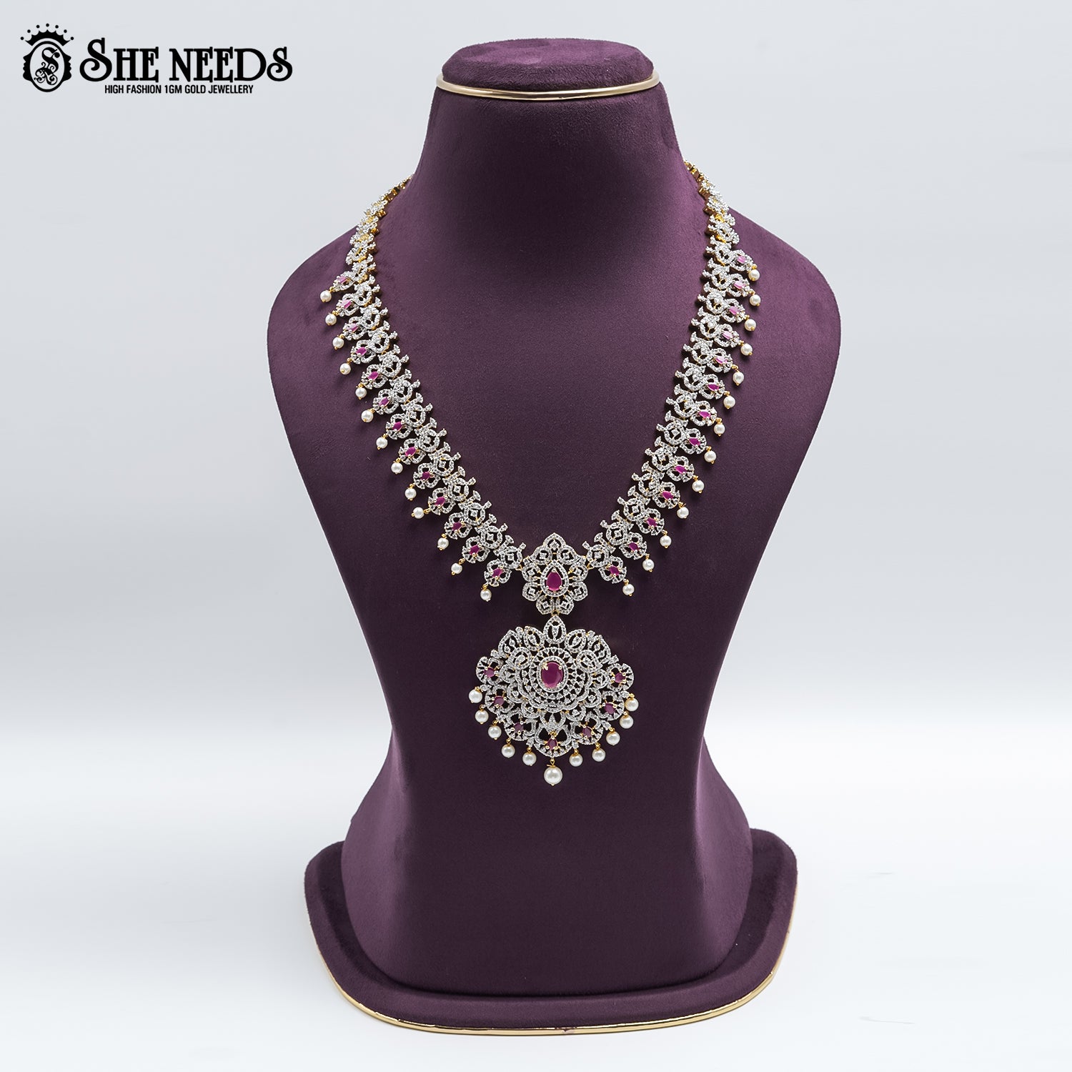 The Royal Grace Gold Necklace Set is a stunning blend of regal charm and intricate craftsmanship. Featuring finely detailed floral motifs, radiant pink gemstones, and elegant pearl hangings, this set is an embodiment of timeless tradition and contemporary sophistication — perfect for weddings and cultural celebrations.
