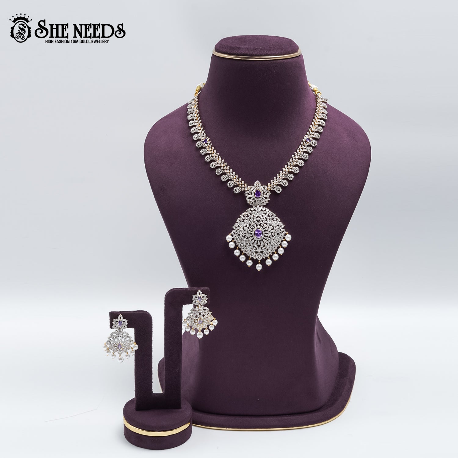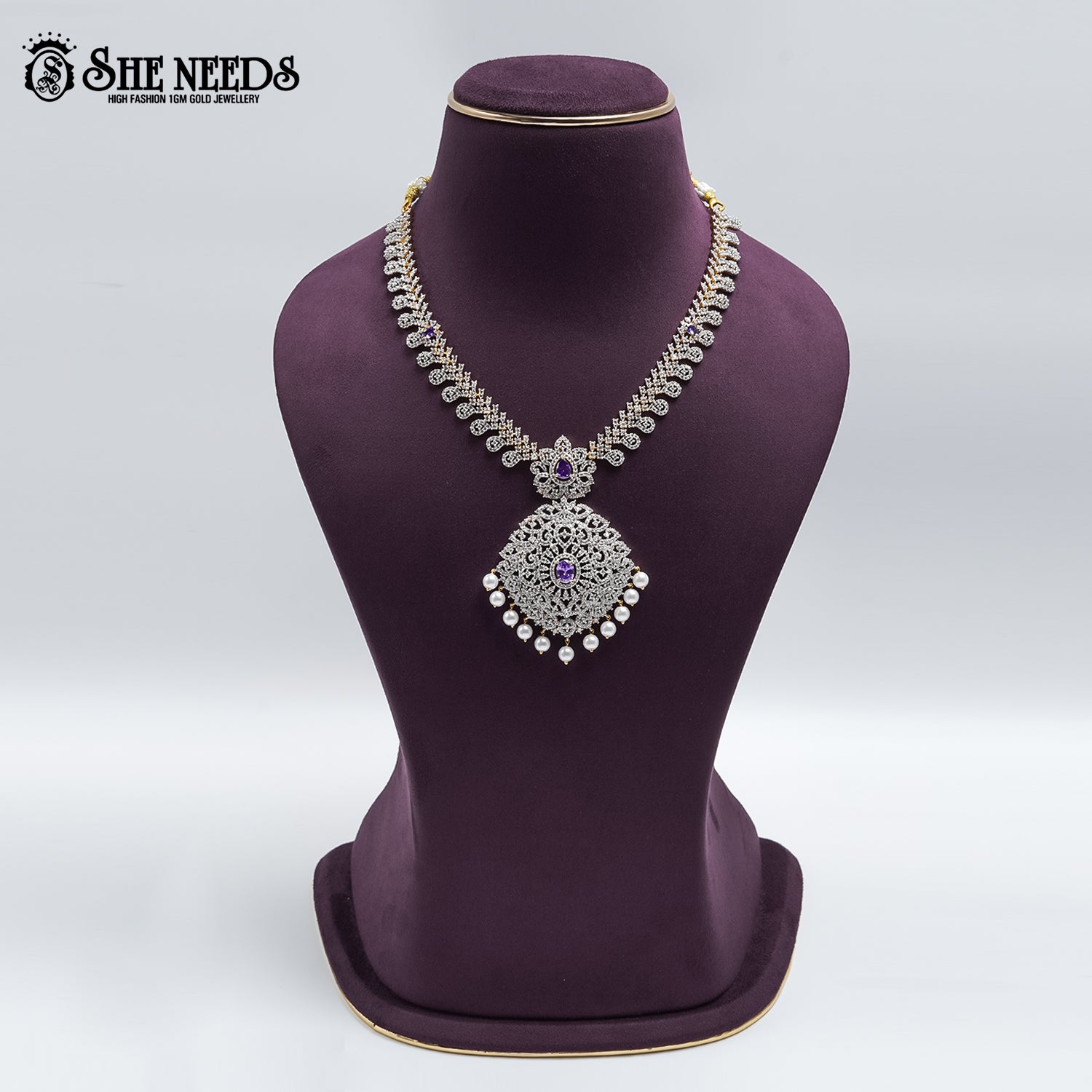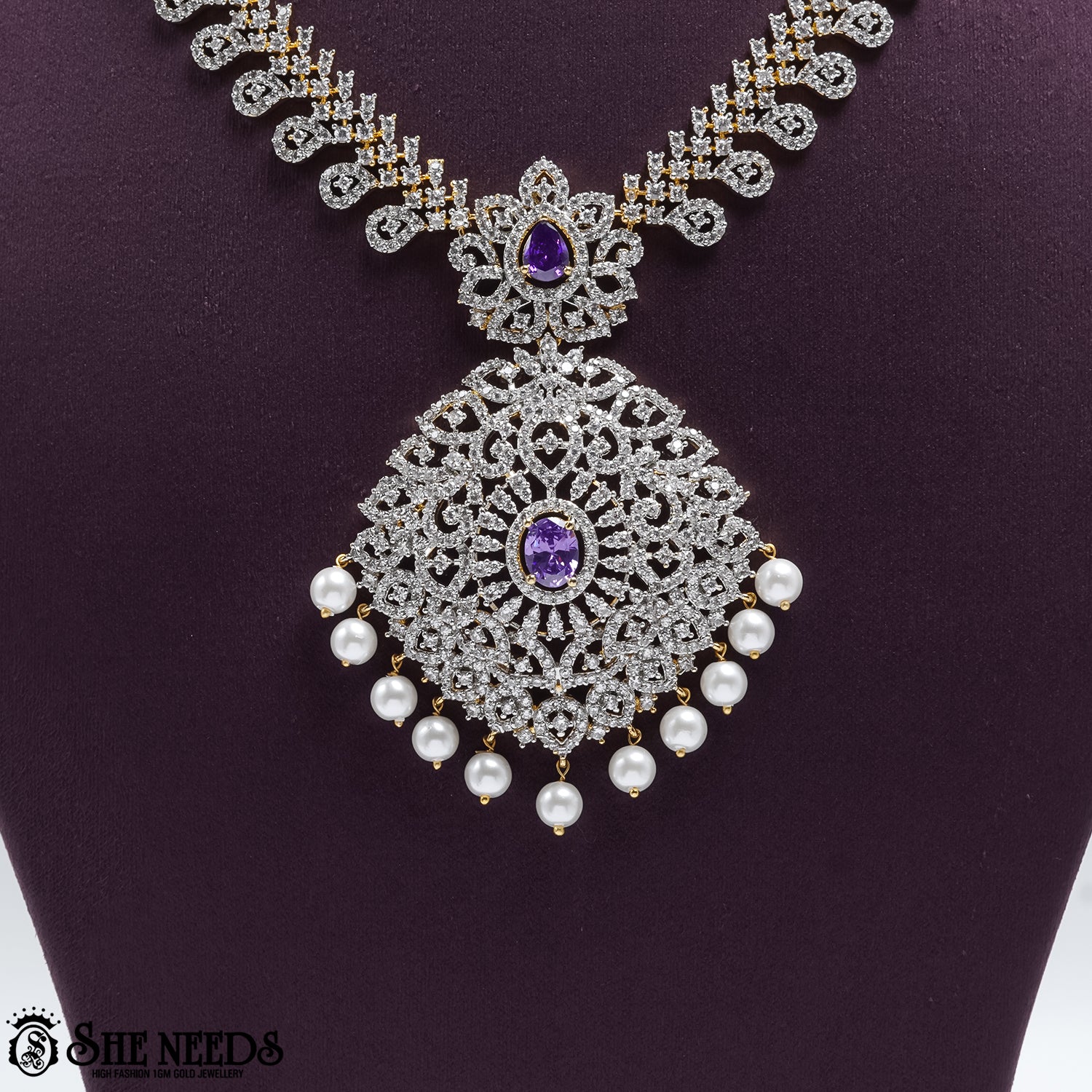 Radiate charm and elegance with the Amethyst Blossom Kundan Pearl Necklace Set. This stunning necklace features a beautiful arrangement of lavender stones framed by sparkling white gems and finished with delicate pearl drops. The floral-inspired filigree and showcase pendant make it perfect for weddings, parties, and festive celebrations.
