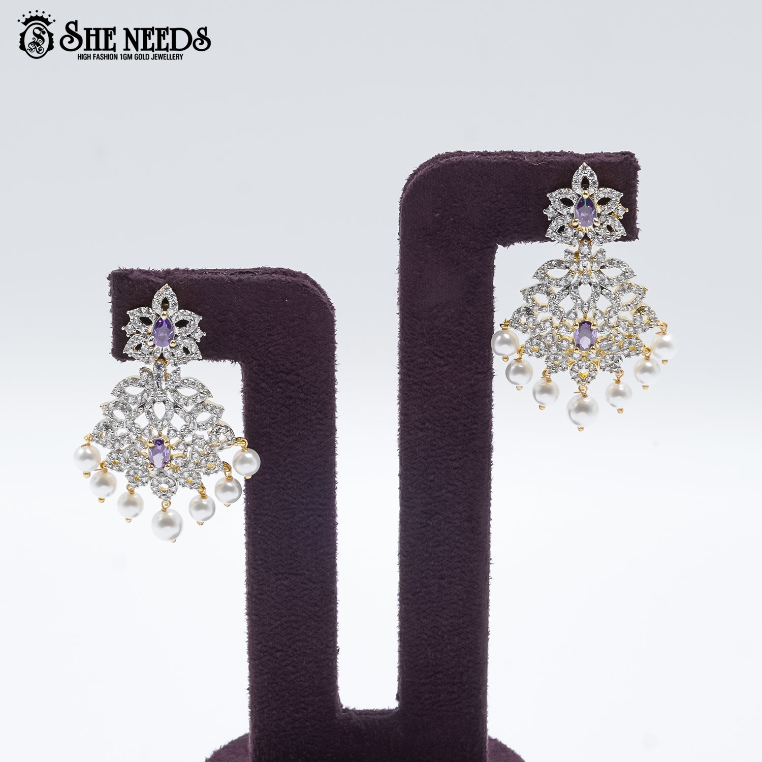 Add a sophisticated touch to any outfit with these Amethyst Blossom Kundan Drop Earrings. Designed with delicate lavender stones and intricate filigree, each earring sparkles with white gems and graceful pearl drops. Lightweight and elegant, they’re perfect for all-day celebrations and pair beautifully with the matching necklace.