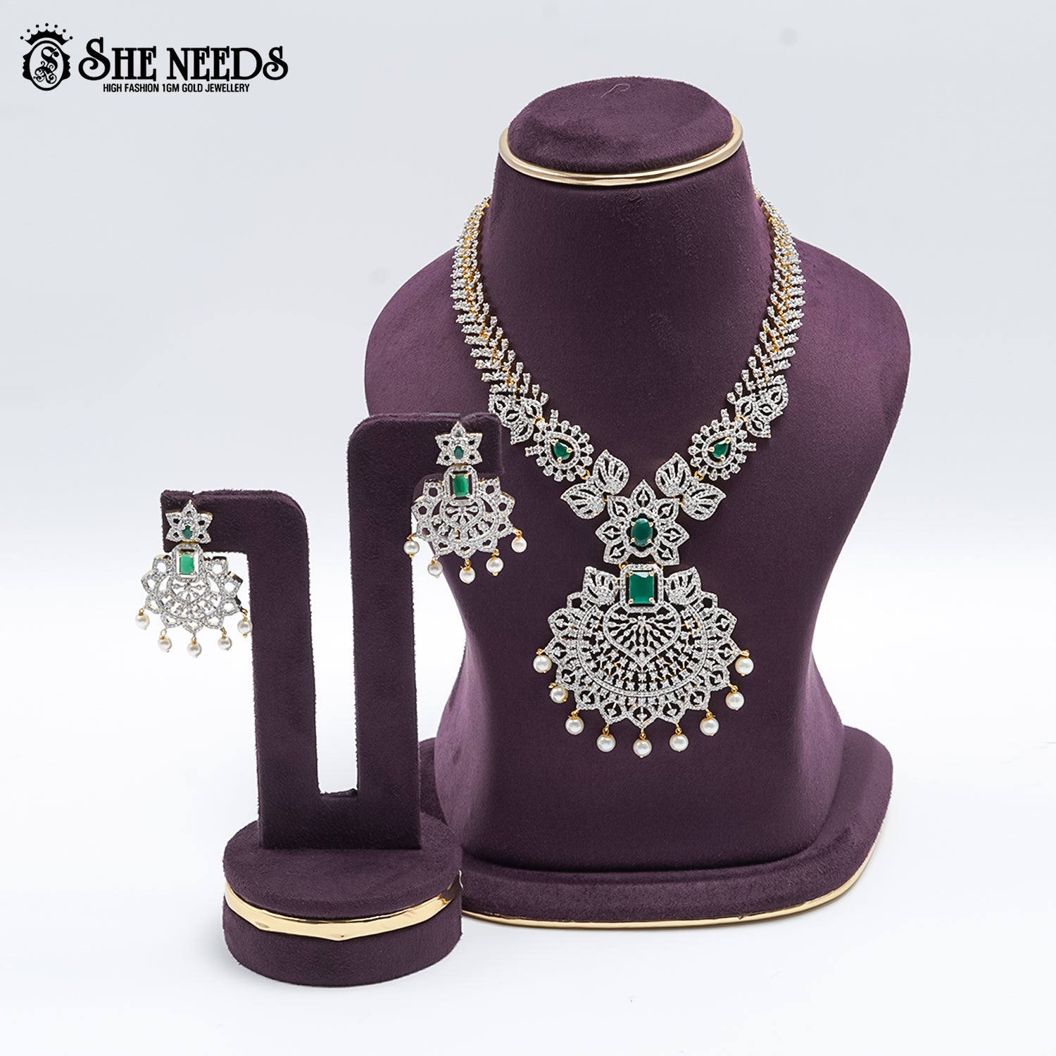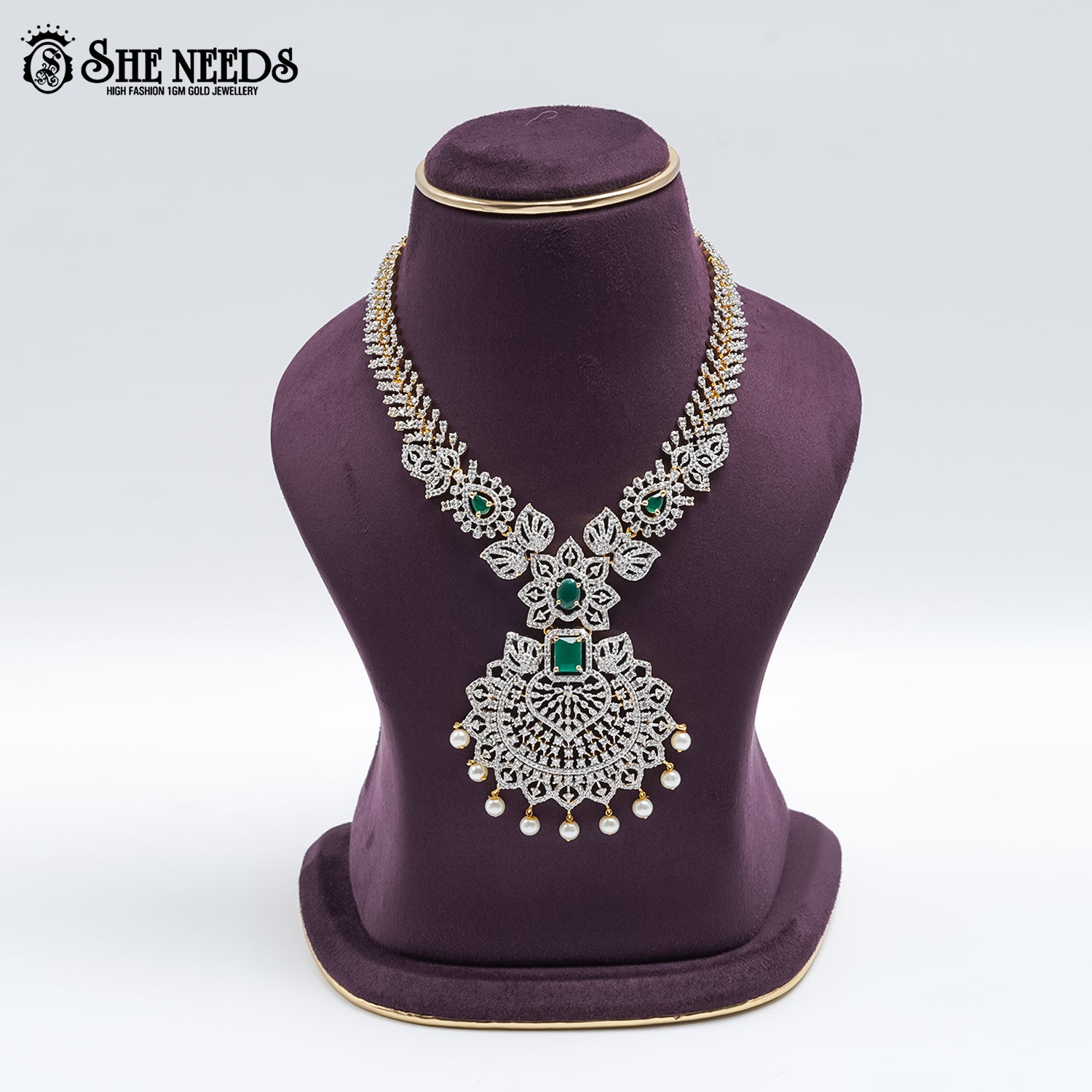 Crafted with intricate detailing and timeless charm, the Regal Bloom Gold Necklace Set is a celebration of elegance and cultural richness. Adorned with sparkling white stones, pearl drops, and vibrant green gems, this necklace set enhances traditional outfits with unmatched finesse.
