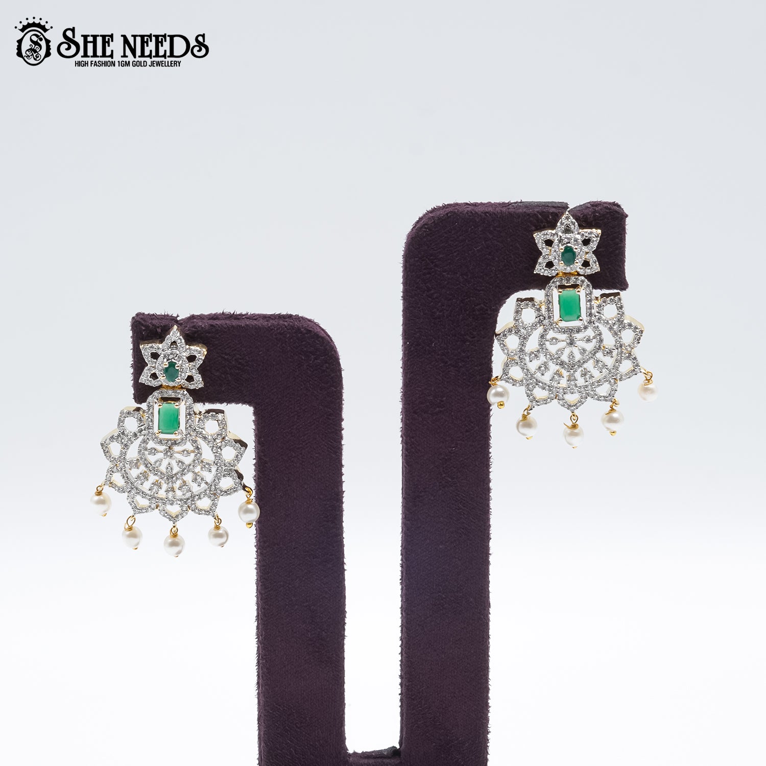 Pair your festive attire with the exquisite Regal Bloom Dangler Earrings. Designed to mirror the necklace’s grandeur, these earrings boast a sophisticated silhouette with intricate patterns and elegant pearl hangings.