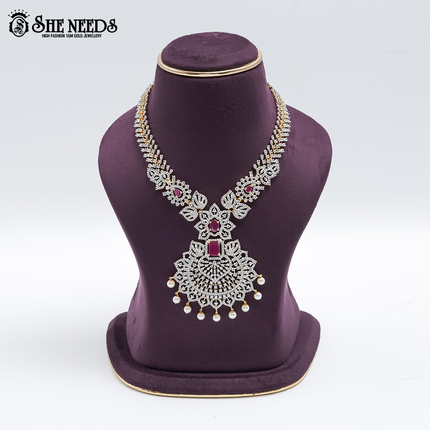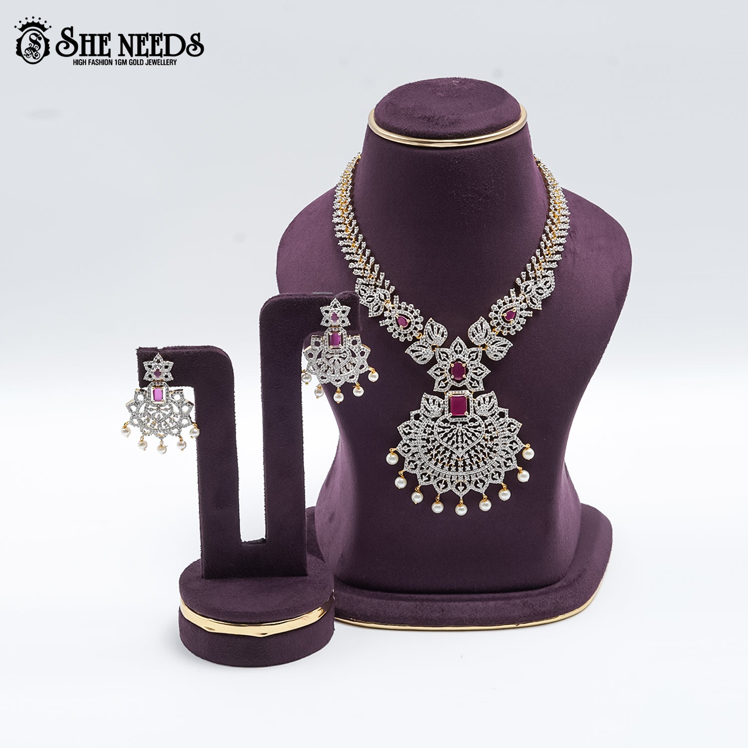 Gracefully designed with a blend of tradition and opulence, the Royal Rose Gold Necklace Set showcases dazzling craftsmanship. Embellished with radiant white stones, delicate pearl droplets, and vivid ruby pink gemstones, this set brings regal elegance to your festive and bridal attire.
