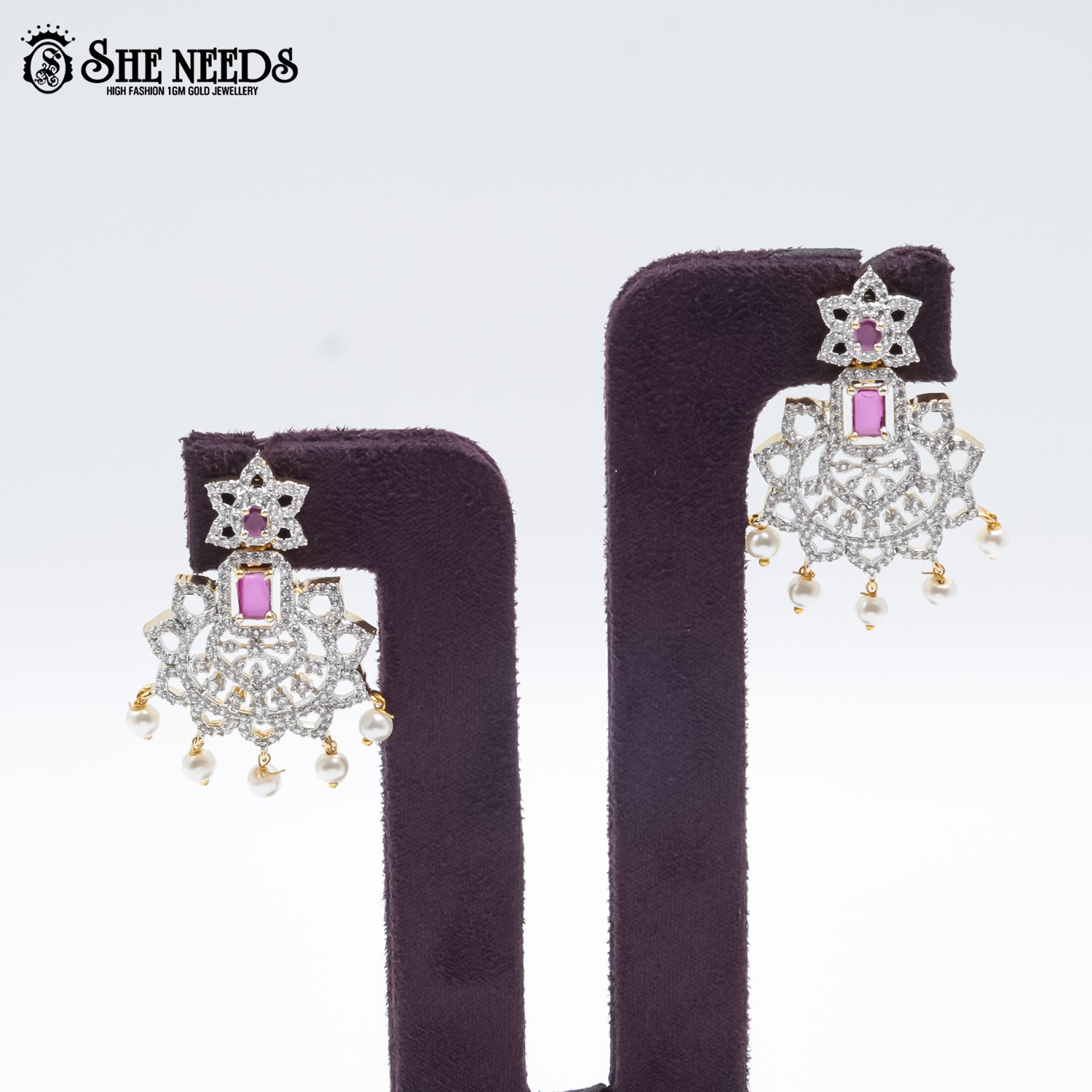 Complete your look with the Royal Rose Dangler Earrings—an epitome of finesse and heritage. Designed in sync with the necklace set, these earrings feature intricate floral motifs, sparkling white stones, and elegant pearl hangings for a luxurious finish.