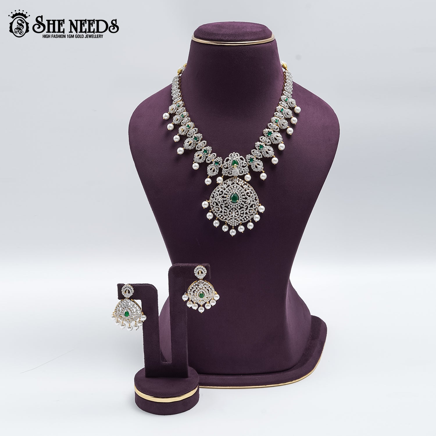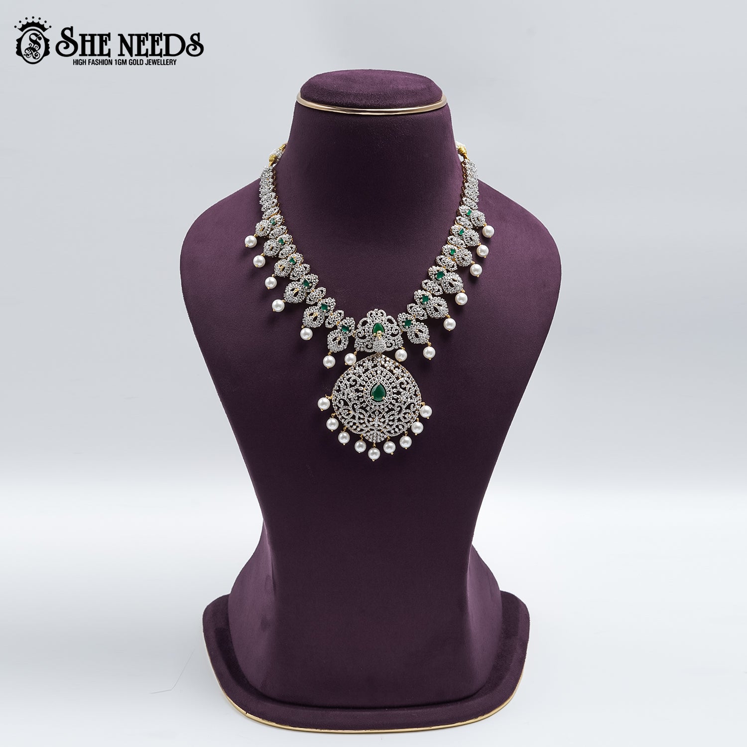 The Royal Pearl & Emerald Necklace Set is a magnificent blend of tradition and elegance. Crafted with sparkling white stones, rich green emerald accents, and classic pearl hangings, this masterpiece reflects regal beauty. The intricate craftsmanship and balanced design make it perfect for weddings, festive occasions, or cultural celebrations. Paired with matching earrings, this set is sure to make a lasting impression.
