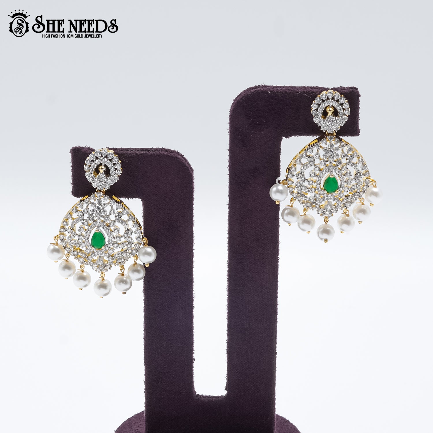 The Royal Pearl & Emerald Earrings are designed to perfectly complement the necklace set, offering elegance with a touch of grandeur. Featuring green emerald accents surrounded by white stones and adorned with delicate pearl drops, these earrings bring out the beauty of traditional jewellery with a modern finish.