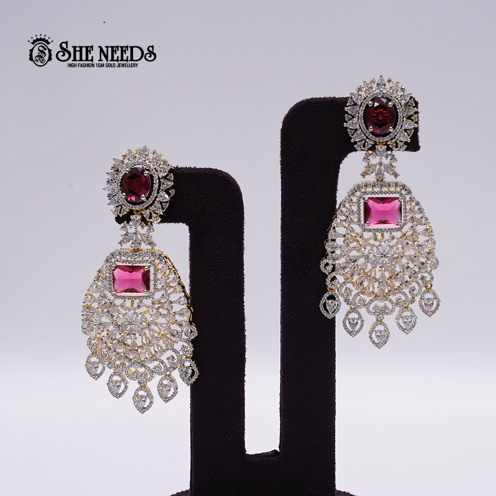 These dazzling long drop earrings feature intricate American diamond work paired with rich pink stones, offering a stunning blend of elegance and glamour for festive and formal wear.