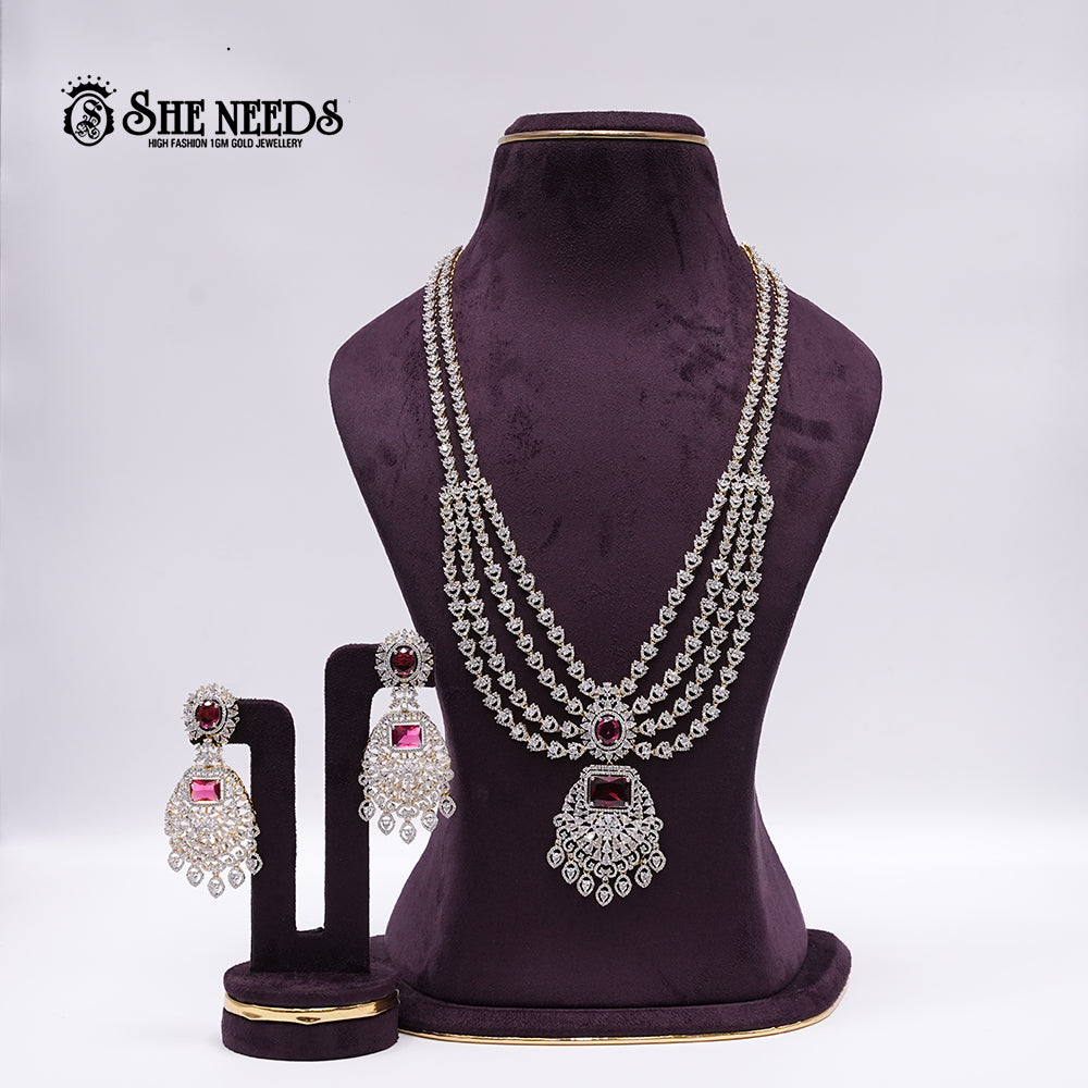 An opulent layered necklace set crafted with sparkling American diamonds and highlighted by radiant pink stones, perfect for making a statement at any grand celebration.