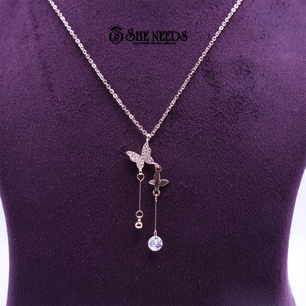 A stylish silver necklace highlighted by two elegant butterflies—one sparkling with stones and the other sleek in metallic shine—finished with contemporary drop charms for added movement. This piece blends playful beauty with modern grace for both daily and special occasions.