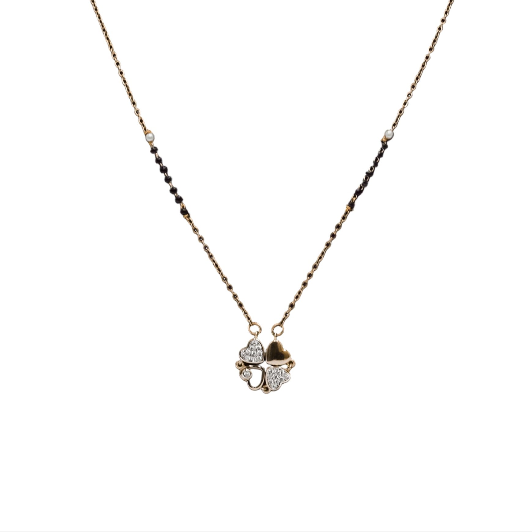 A modern twist on tradition, this delicate 1gm gold-plated mangalsutra features a chic clover-shaped pendant adorned with sparkling CZ stones, symbolizing love and good fortune.