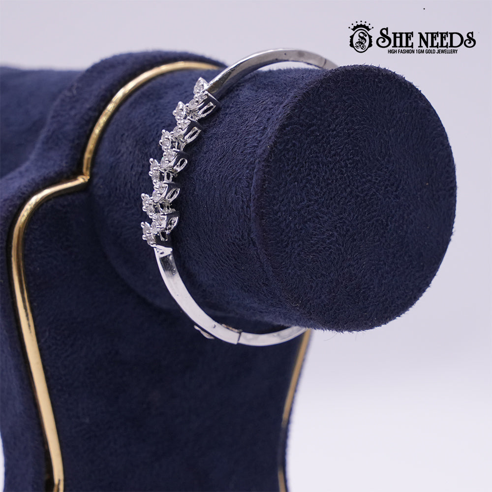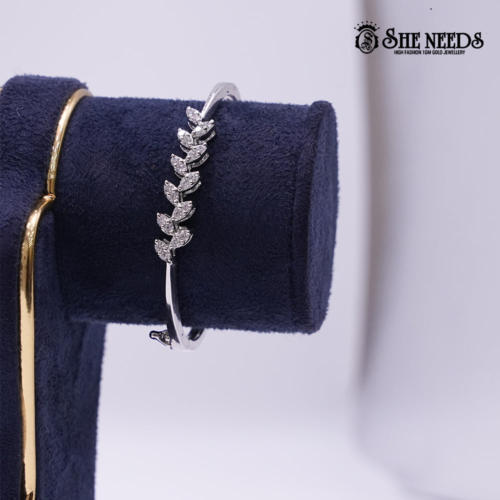 Enhance your contemporary and ethnic wardrobe with this chic pair of Kada Bangles from She Needs. Designed with a graceful leaf motif, these bangles exude elegance with every sparkle. Crafted with high-quality 1GM silver finish, each bangle is adorned with brilliant CZ stones arranged in a vine-like pattern, offering a modern twist on classic jewelry. Perfect for weddings, festive wear, or everyday glam.