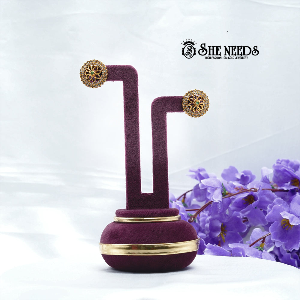 - Features: Lotus motif centre, emerald-green accent stone, enamel work, dual CZ halo, secure push-back closure