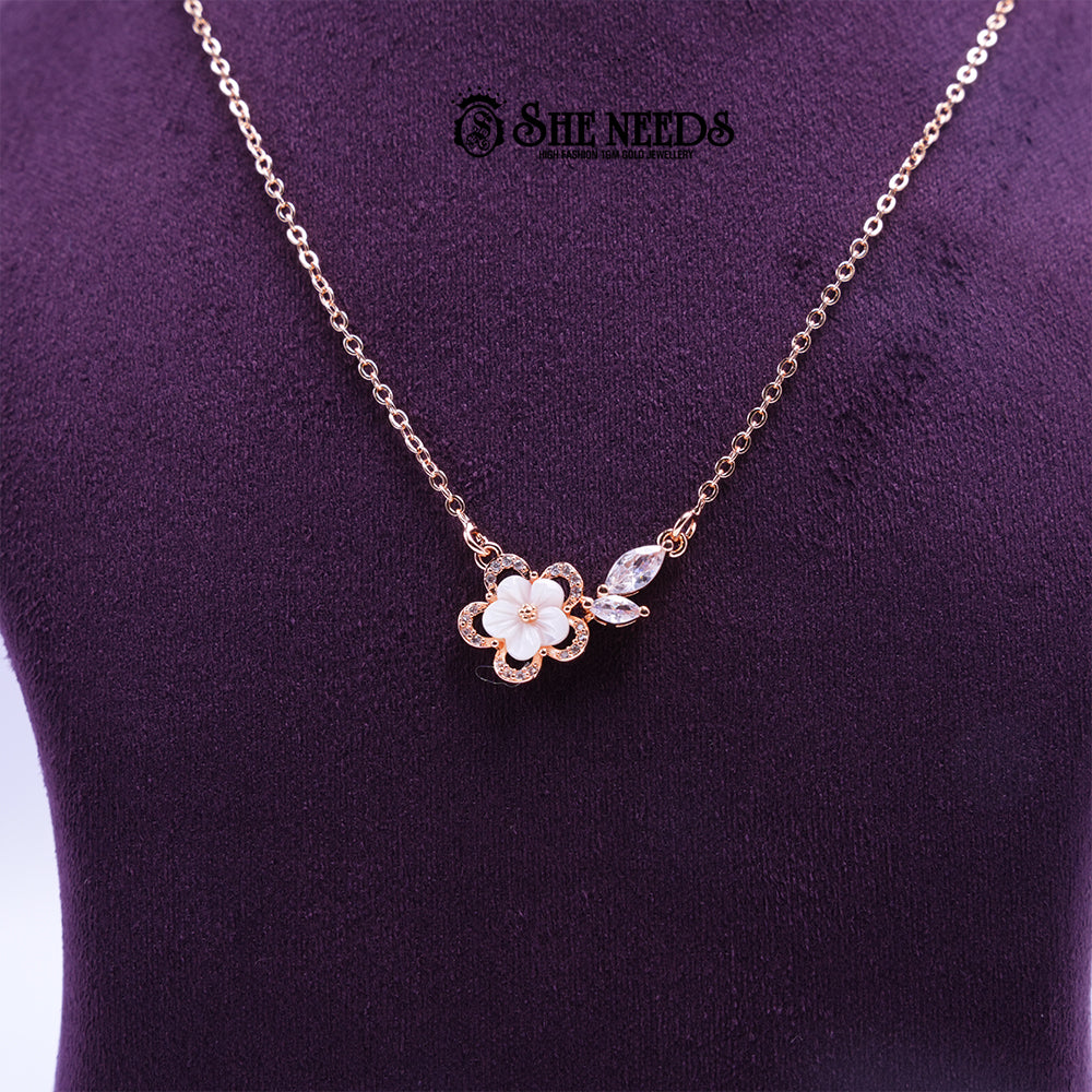 A delicately crafted rose-gold necklace adorned with a charming white enamel flower and twin leaf accents studded with sparkling stones. This graceful piece adds a soft yet radiant touch, perfect for uplifting any modern or festive look.