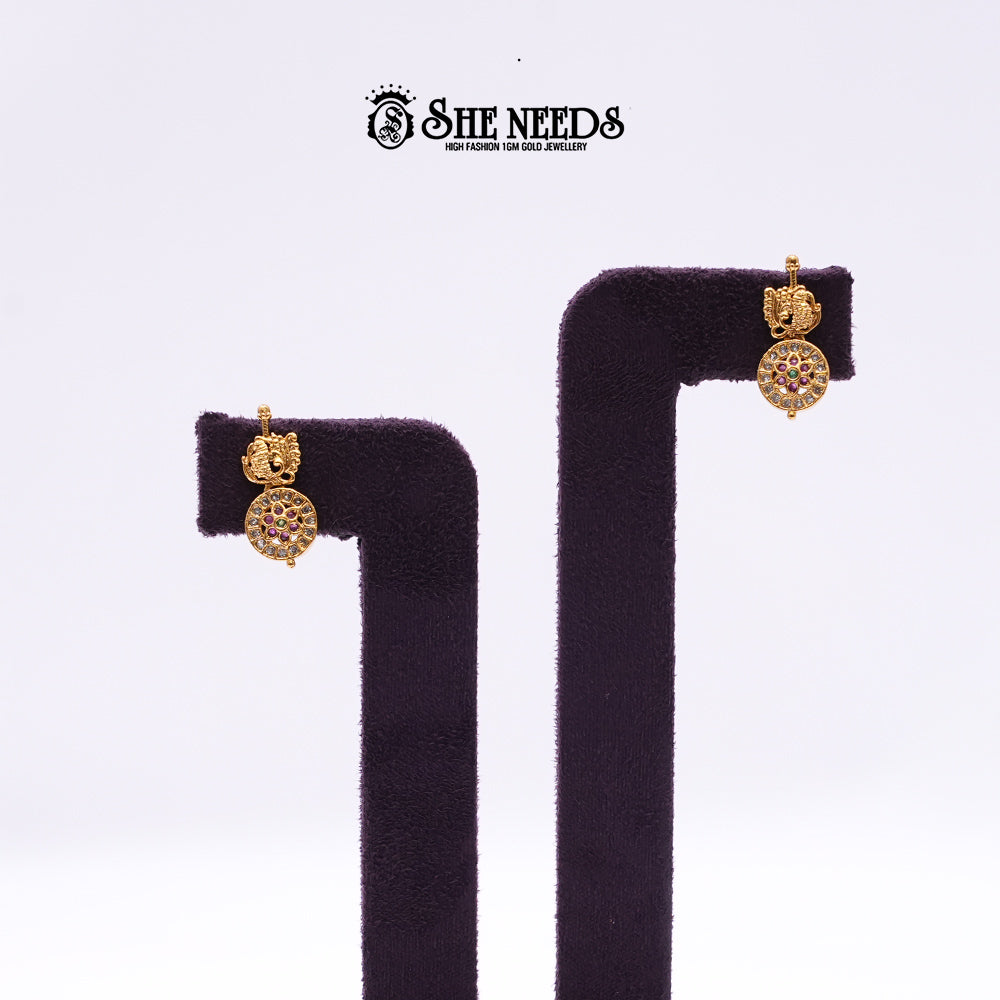 Sacred meets stylish in these exquisite earrings featuring the iconic Goddess Lakshmi motif paired with a dazzling round drop of colored stones. A graceful complement to ethnic and festive wear.