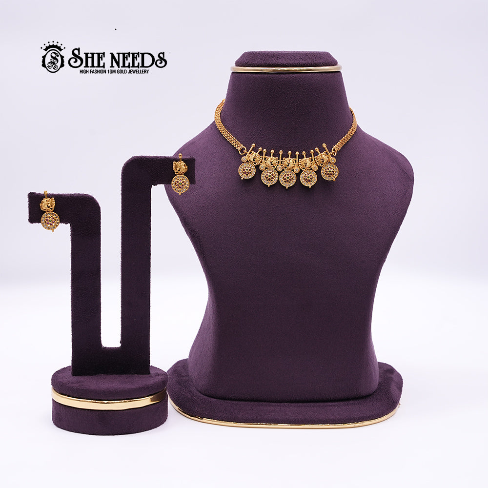 This divine 1gm gold necklace set is inspired by traditional coin motifs and adorned with intricate temple-style detailing, perfect for showcasing cultural elegance with spiritual charm.