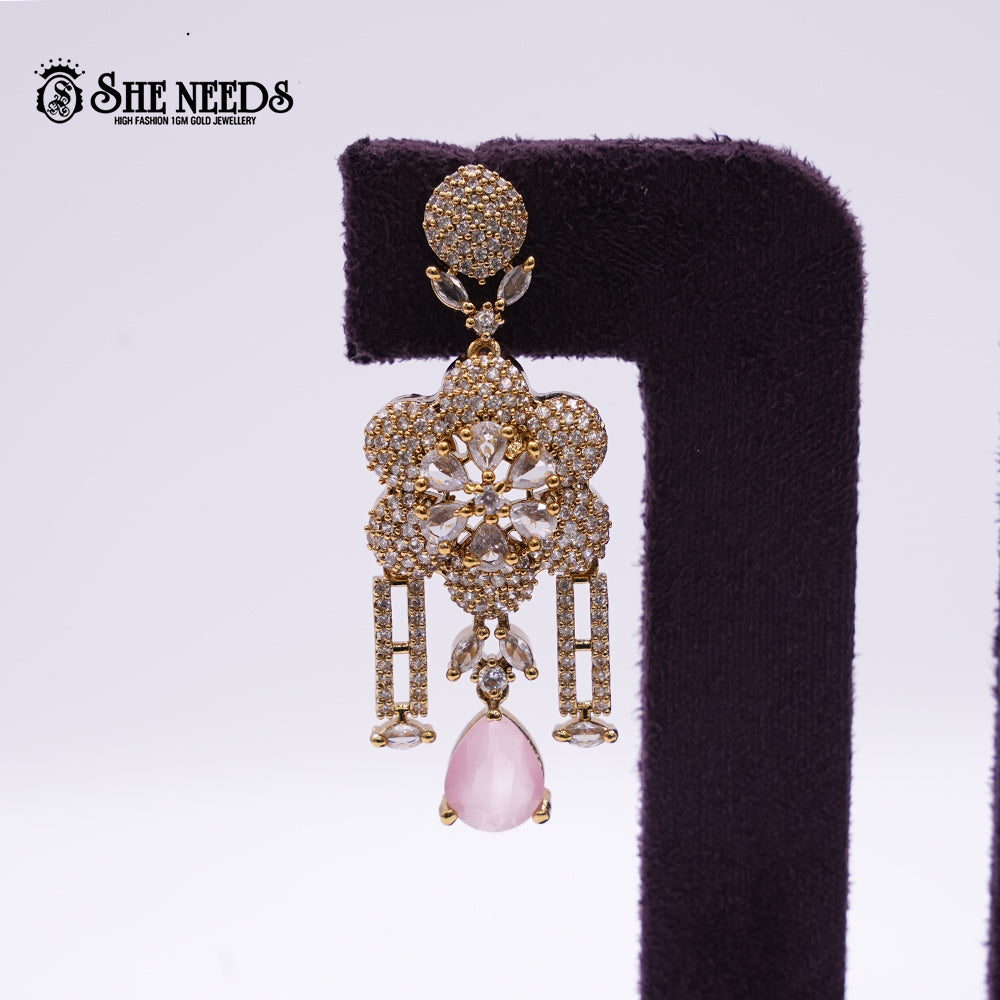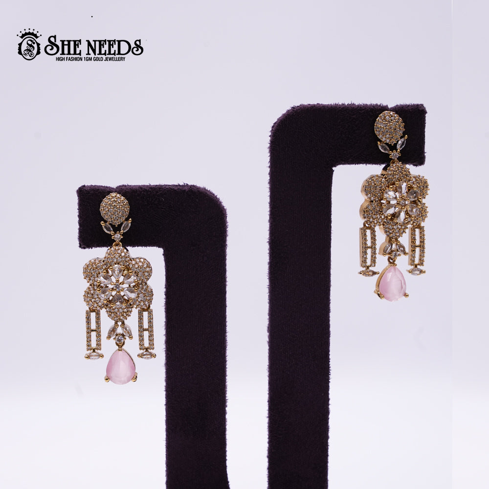 Radiate elegance with these Floral Drop Earrings from She Needs. The design features a stunning six-petal floral motif encrusted with micro CZ stones and centered with teardrop-shaped clear crystals. Twin vertical bar drops, also studded with CZ stones, frame a delicate marquise stone accent that leads to a pink teardrop gemstone at the base. Perfect for weddings, evening parties, and festive occasions, these earrings combine intricate craftsmanship with graceful femininity.
