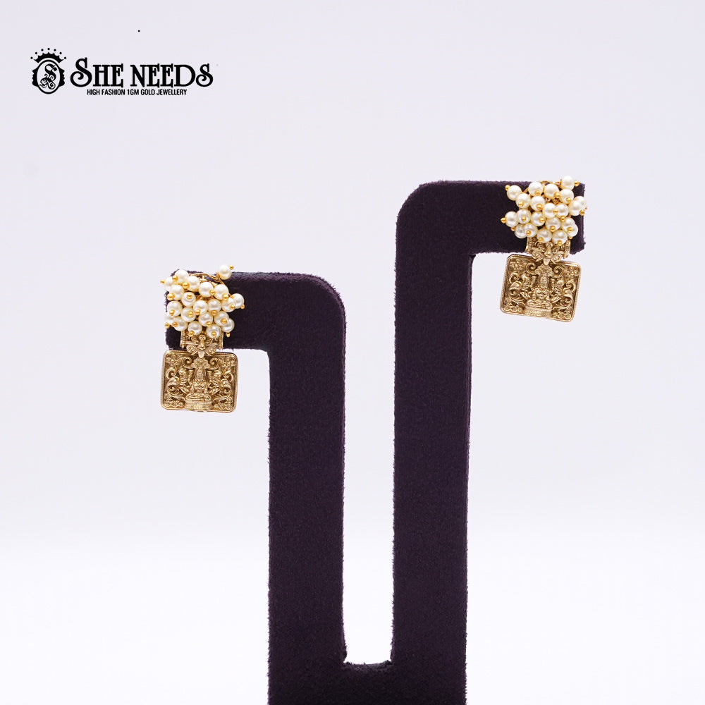 Elevate your traditional ensemble with this divine Temple Pearl Necklace Set from She Needs. Intricately strung with clusters of white faux pearls, the necklace features prominent rectangular gold temple motifs inspired by classical Indian heritage. The matching earrings mirror the same motif and pearl detailing, offering a regal, goddess-like charm. A statement piece of ethnic excellence.