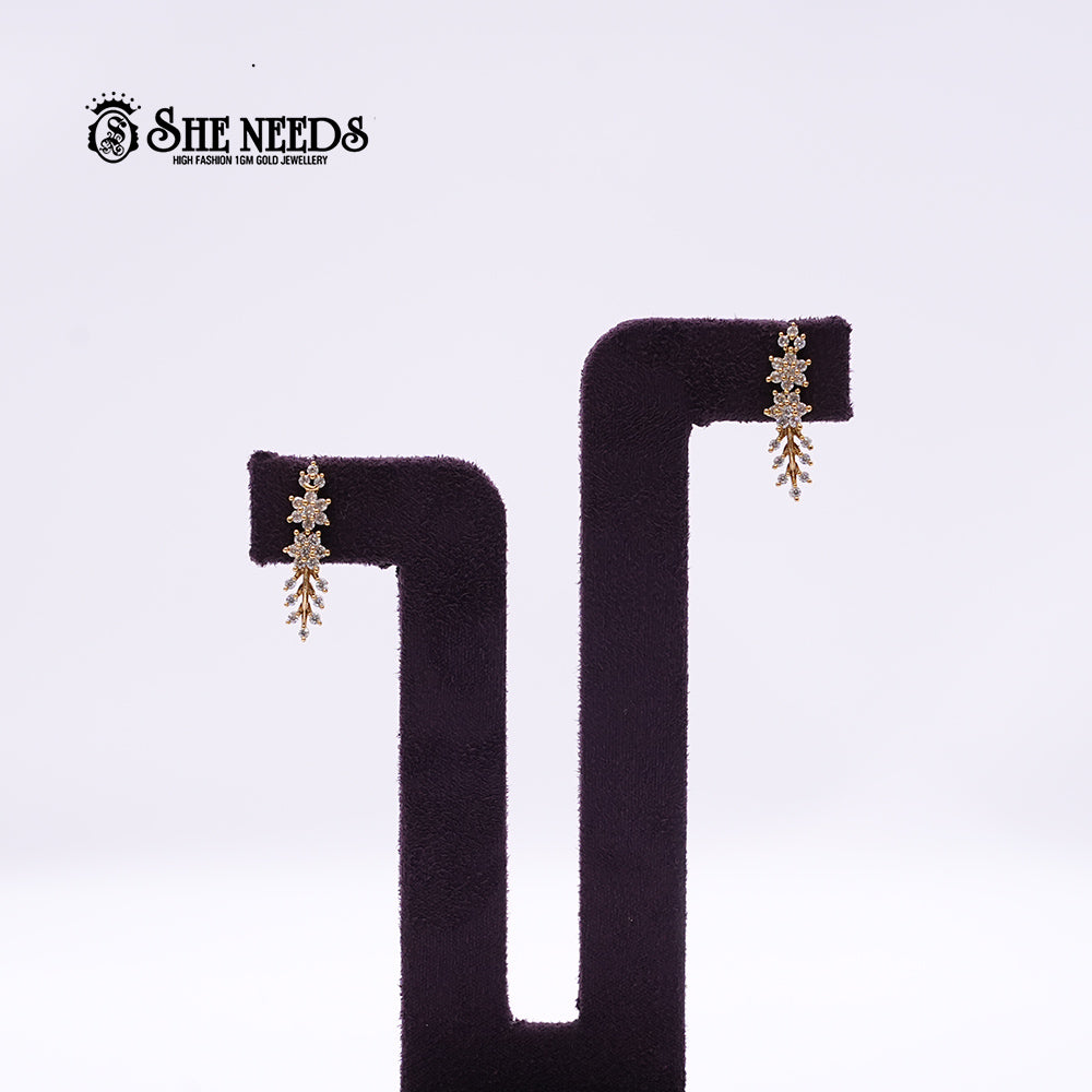 Drape your ears in elegance with the Golden Dewdrop Drop Earrings. These floral-inspired beauties feature a drop pattern that mimics glistening dewdrops, bringing sparkle and sophistication to any outfit. Designed for versatility, they can elevate both festive and formal wear.