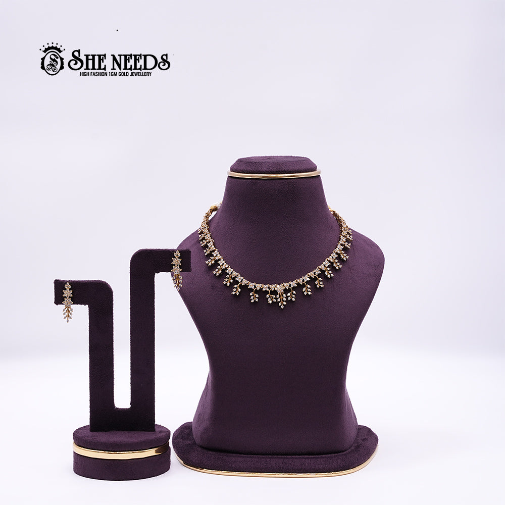 Embodying timeless elegance, the Golden Dewdrop Pendant Necklace Set by She Needs showcases a cascade of shimmering dewdrop motifs. The delicate alignment of American diamonds on a gold-toned base brings out an understated yet luxurious appeal. A versatile set ideal for traditional celebrations and graceful evening occasions.