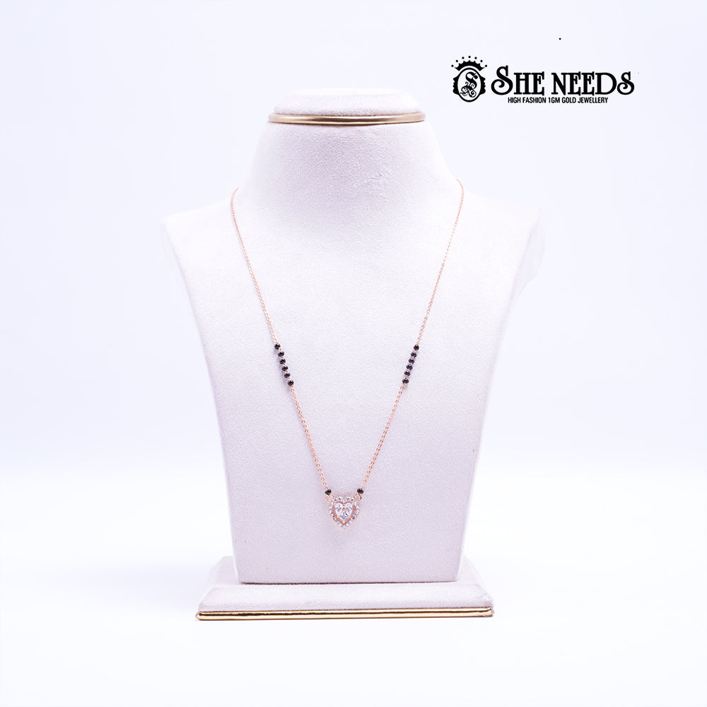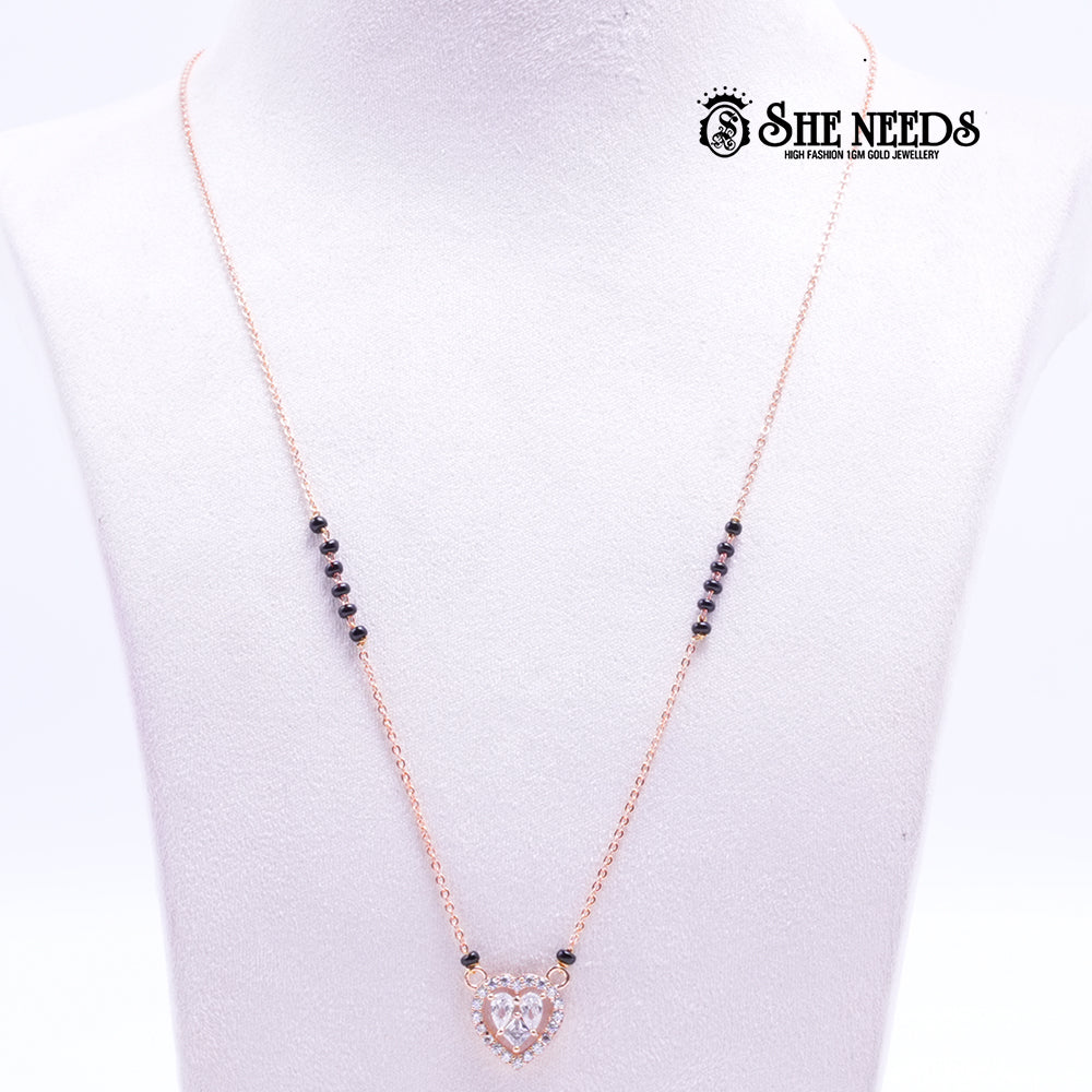 A delicate rose-gold mangalsutra necklace featuring a sparkling heart-shaped pendant, accented with classic black beads for a modern twist on tradition. This graceful piece is perfect for daily elegance or meaningful occasions.