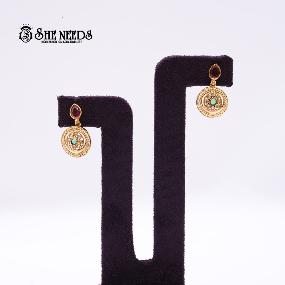 Enhance your traditional wardrobe with the Royal Bloom Drop Earrings. Designed with a striking ruby-toned teardrop stud and a detailed circular charm, these earrings bring a vintage yet versatile appeal to any ethnic or fusion outfit.