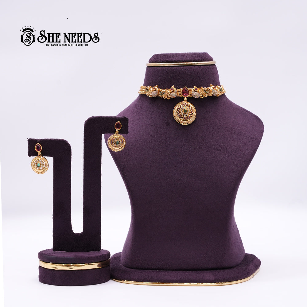 The Royal Bloom Gemstone Necklace Set by She Needs blends regal charm with artisanal finesse. Adorned with intricately embossed circular pendants and crowned with ruby-toned teardrops, this necklace showcases vintage Indian craftsmanship. Paired with a matching choker design and gemstone-studded earrings, this set is perfect for making a statement at weddings and festive occasions.