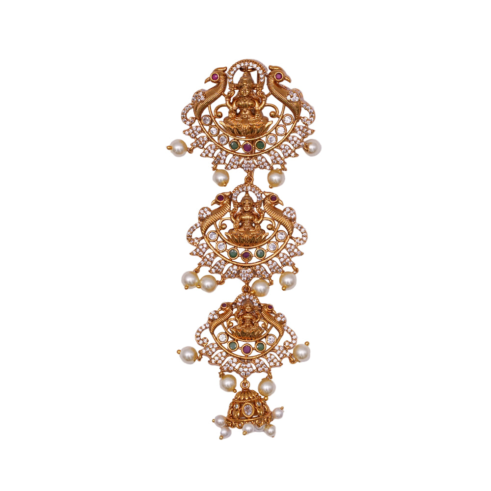 Enhance your bridal or festive hairstyle with this stunning temple-style Jada Set from She Needs. Showcasing an elaborate depiction of Goddess Lakshmi seated in divine grace, accompanied by intricately carved peacocks and elephants, this piece is a tribute to traditional temple jewelry. Embellished with shimmering CZ stones, ruby and emerald-toned gems, and elegant pearl danglers, this Jada set is crafted to make a statement. Ideal for South Indian bridal looks or classical dance performances, its antique gold matte finish and detailed craftsmanship exude timeless elegance.