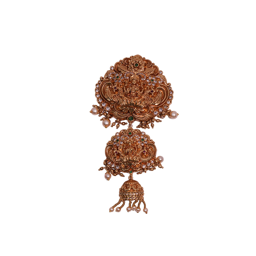 Grace your traditional look with this intricately designed Temple Jada Set from She Needs. Featuring a divine depiction of Goddess Lakshmi seated on a blooming lotus and framed by grand peacock motifs, the piece glows with antique finesse. Embellished with CZ stones and highlighted by green-toned synthetic gems, the design is completed with pearl danglers and a temple-style jhumka drop, making it perfect for weddings and classical dance performances.