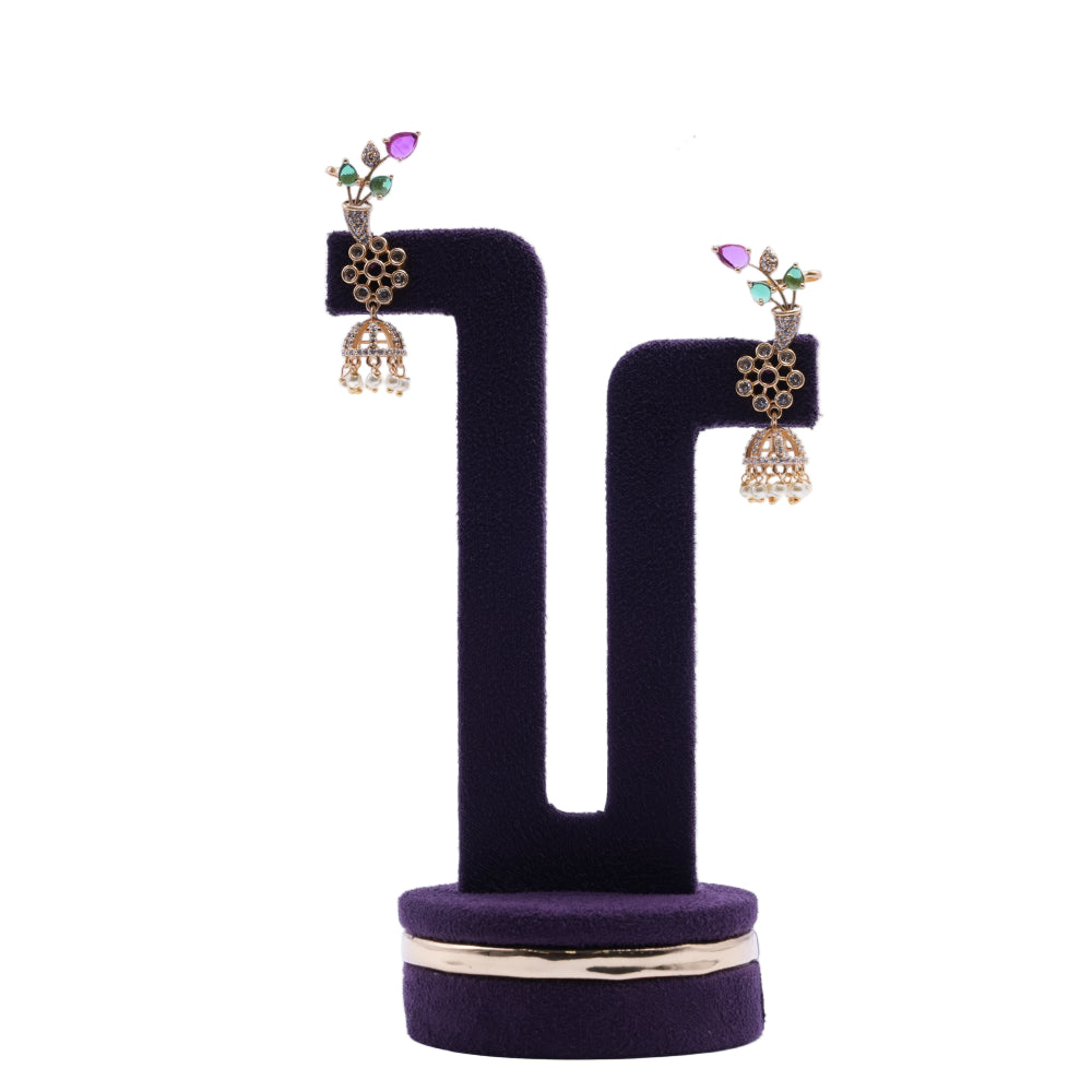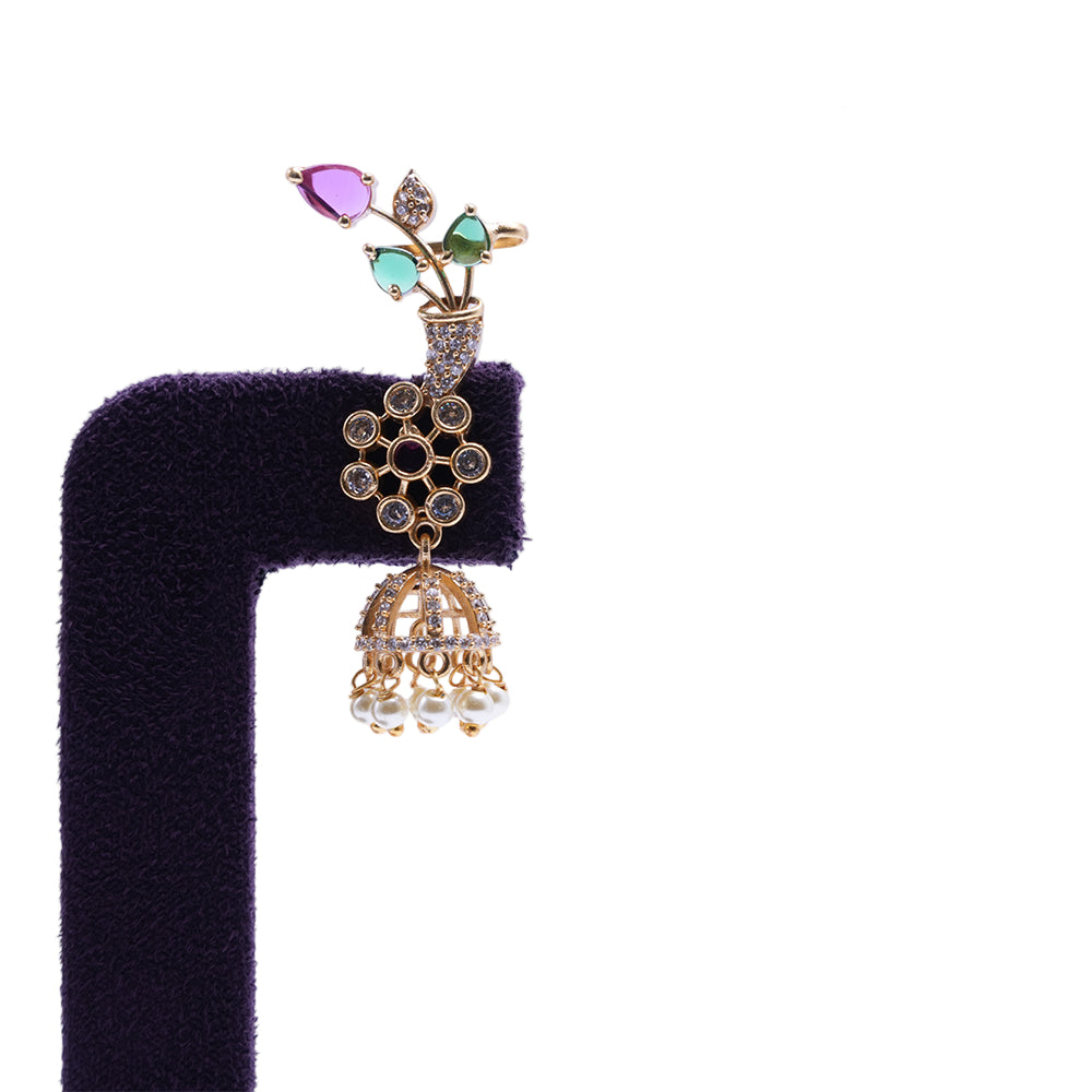 Artistic jhumka earrings featuring a vibrant pot and floral motif with pink and green stones, finished with intricate golden domes and pearl drops.