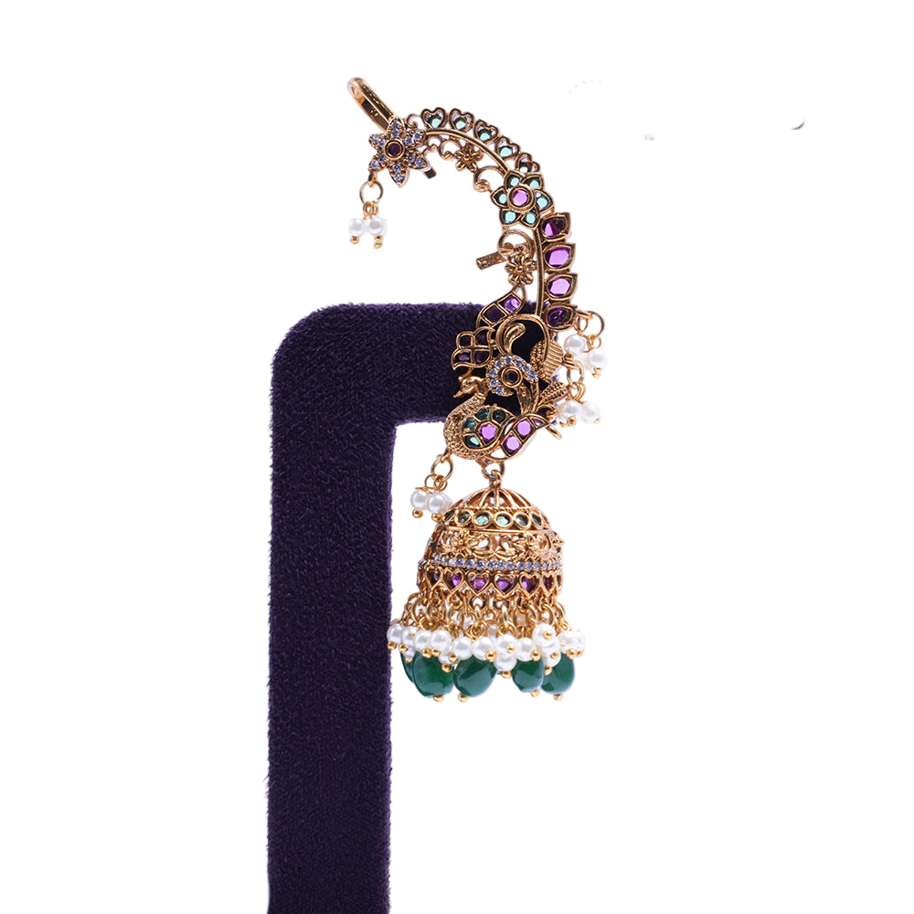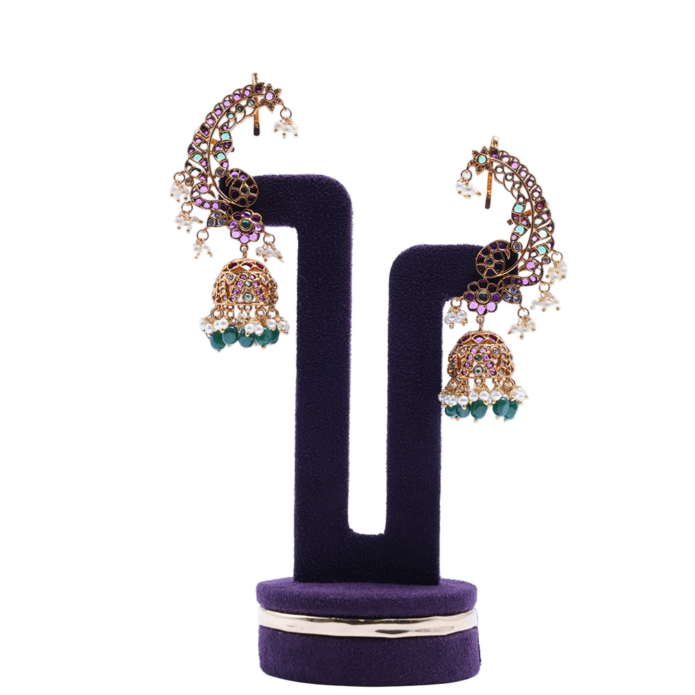 The Peacock Arch Jhumka Earrings bring together a royal blend of artistry and tradition. Designed with an intricate peacock-inspired arch, they feature purple and green stones with floral detailing, leading to golden dome jhumkas. The jhumkas are beautifully finished with green bead drops and pearl hangings, making them a vibrant choice for festive and traditional attire.