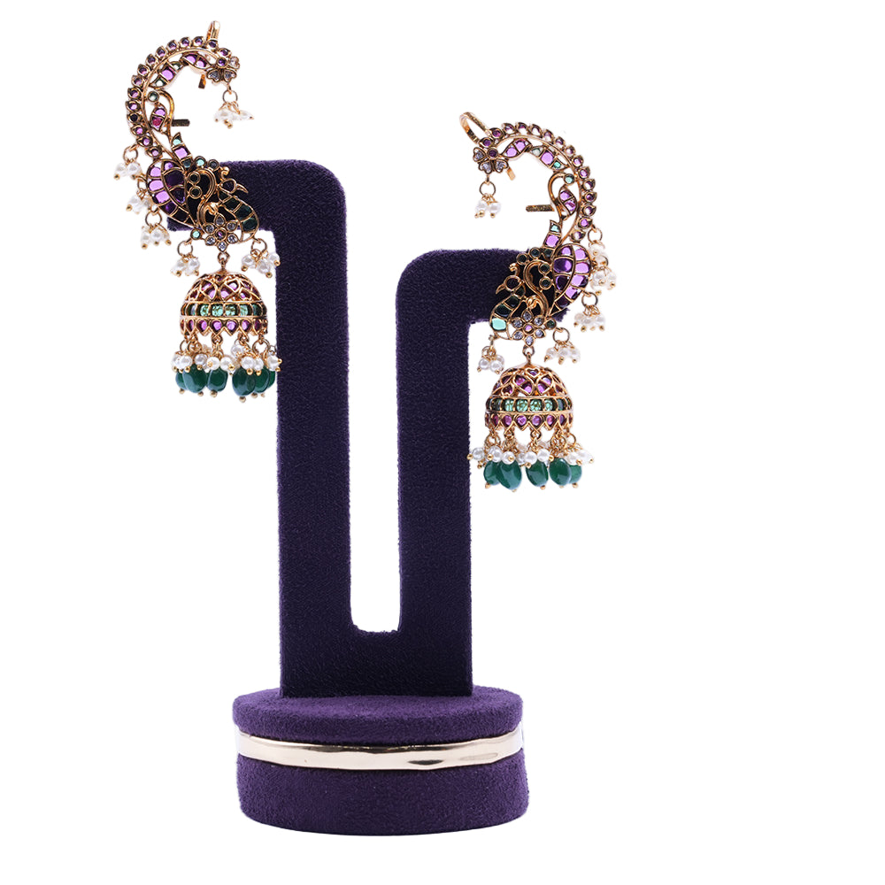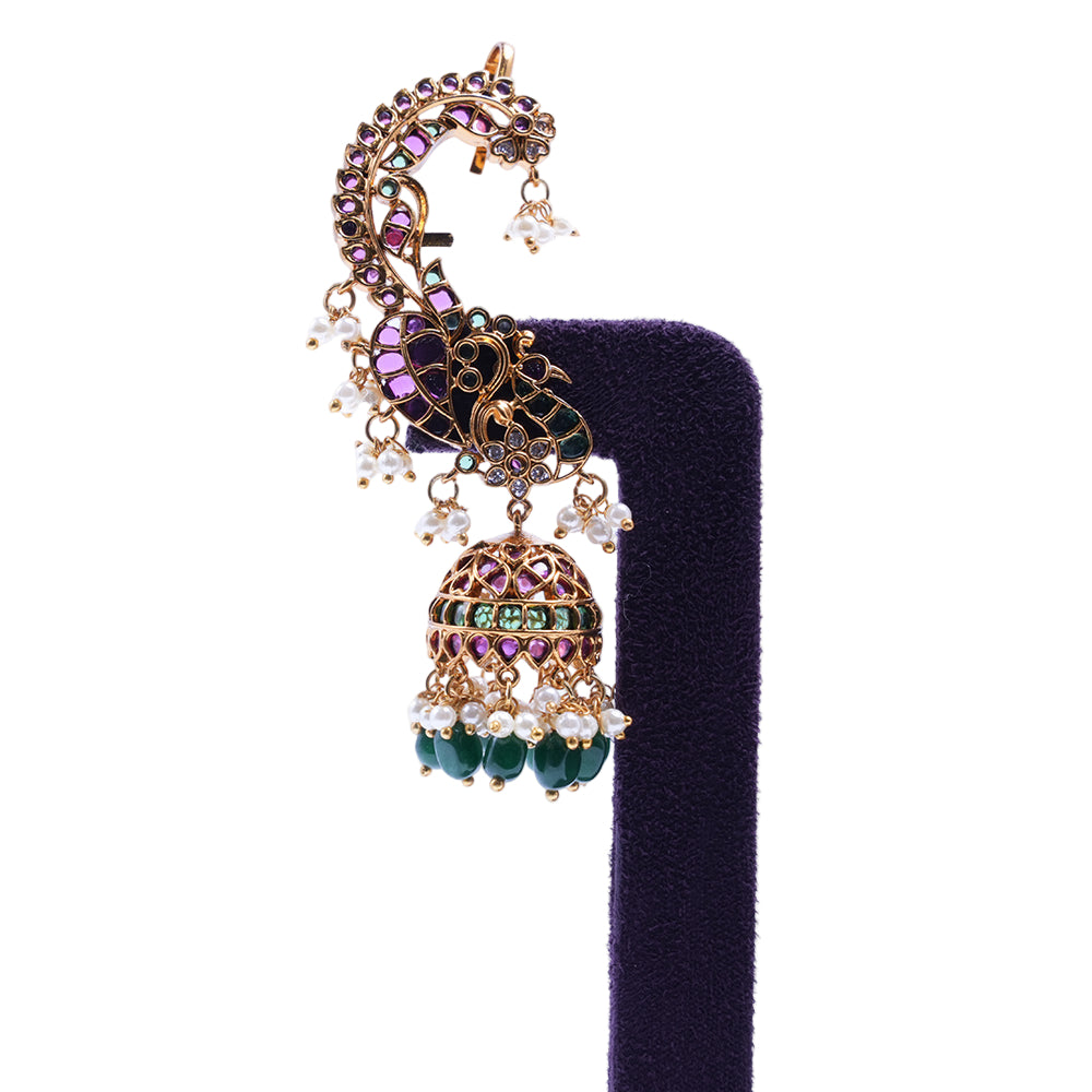 The Regal Peacock Emerald Jhumka Earrings feature an exquisite peacock-inspired arch adorned with purple and green stones. The design flows gracefully into golden dome-shaped jhumkas highlighted with emerald green bead drops and delicate pearl hangings. These earrings are the perfect blend of traditional charm and royal elegance, making them ideal for festive and wedding occasions.