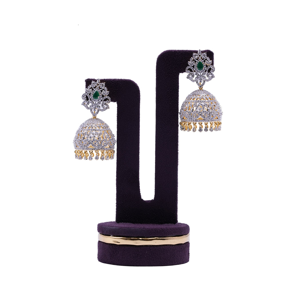 The Emerald Majesty Luxe Jhumka Earrings are a true masterpiece of regal artistry and festive brilliance. A rich pear-shaped emerald stone sits gracefully at the heart of an ornate floral stud, surrounded by sparkling crystals. The dome-shaped jhumka features a grand lattice design, fully encrusted with dazzling pavé stones that exude royal charm. Finished with golden danglers and crystal drop accents, these earrings offer fluid elegance and timeless beauty. Perfect for brides, festive occasions, and traditional celebrations, they are designed to make every moment shine brighter.