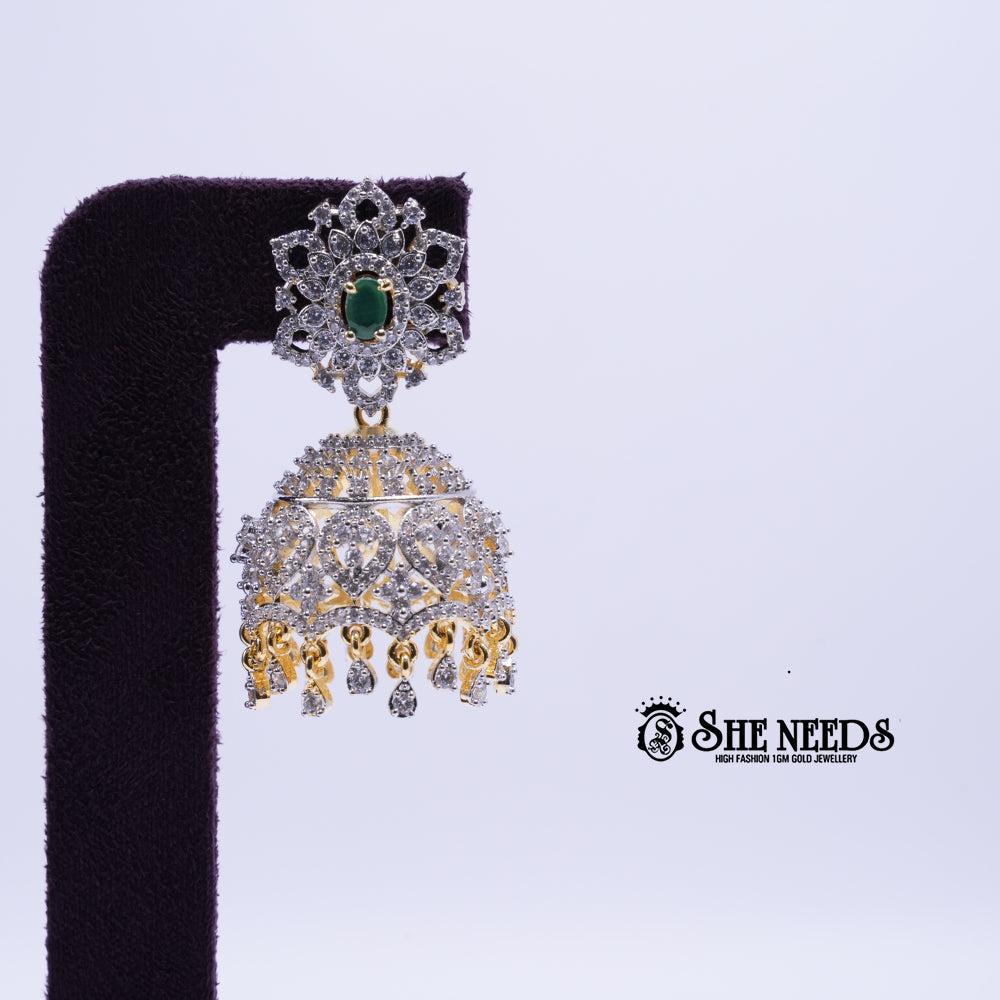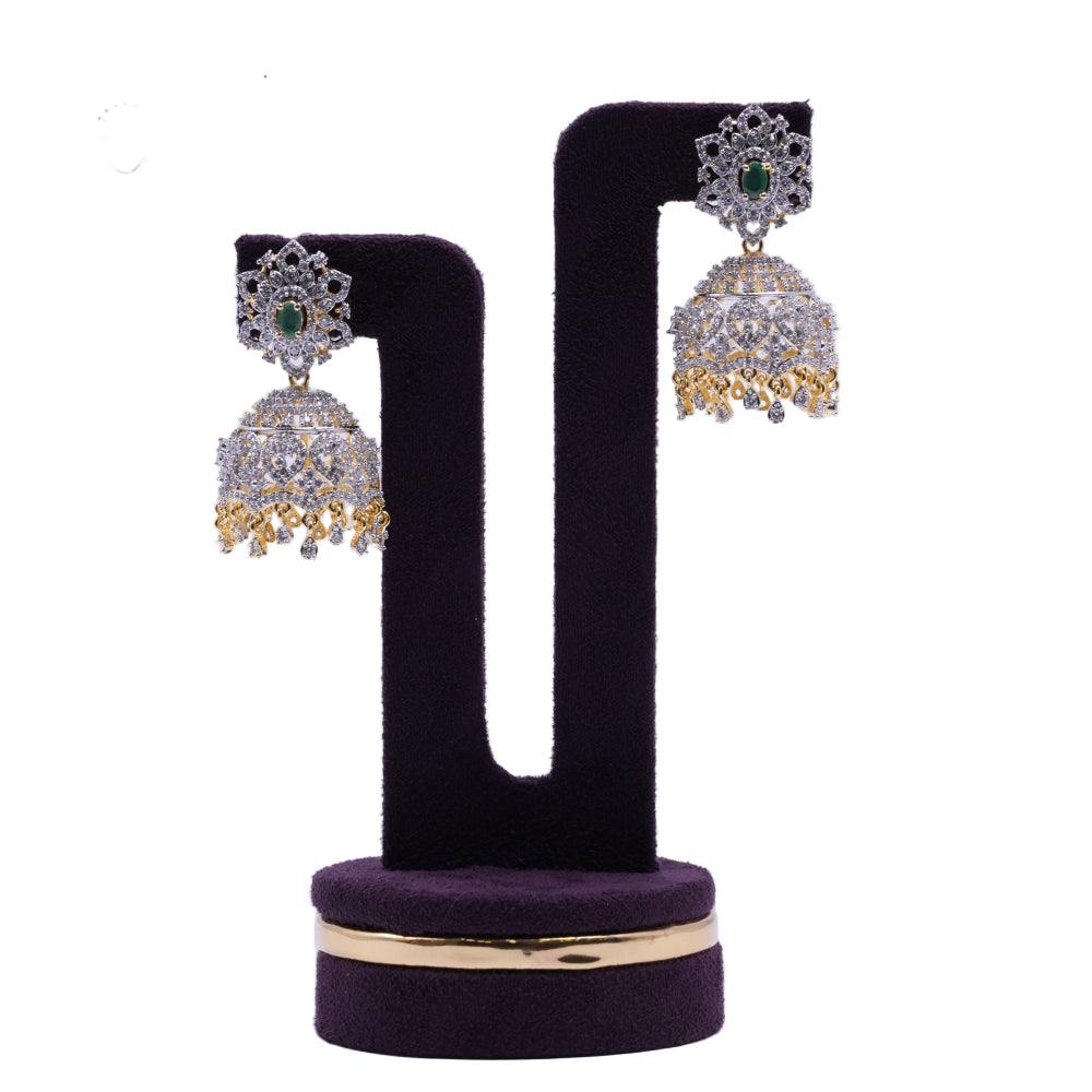 The Ruby Radiance Jhumka Earrings are a striking blend of regality and tradition. Featuring a deep ruby-red stud surrounded by a halo of sparkling white stones, these earrings radiate sophistication. The dome-shaped jhumka is encrusted with rows of shimmering crystals, capturing light from every angle. Golden danglers tipped with dazzling white stones add graceful movement and charm, making them an elegant choice for any occasion. Perfect for weddings, festive celebrations, or bridal ensembles, these earrings embody timeless beauty and grandeur.