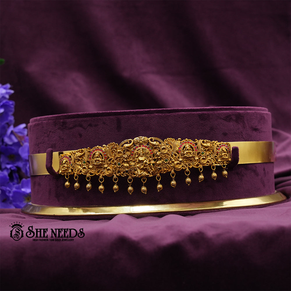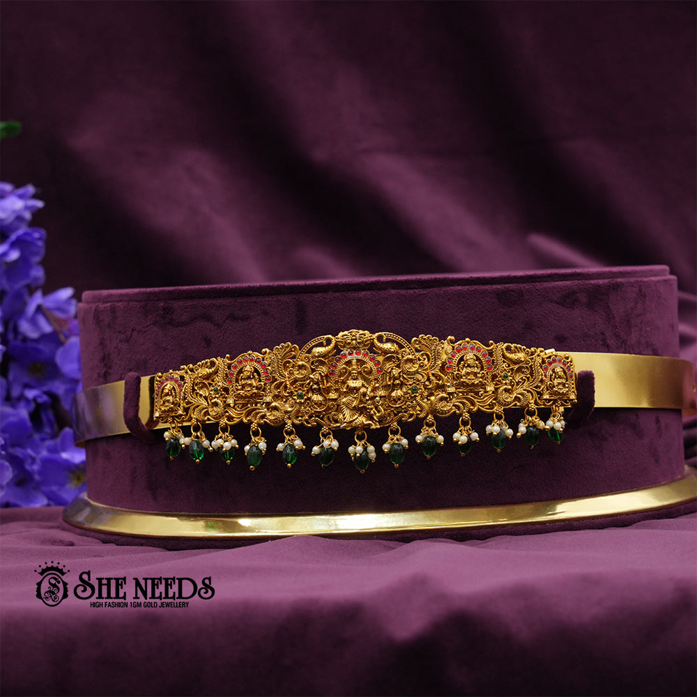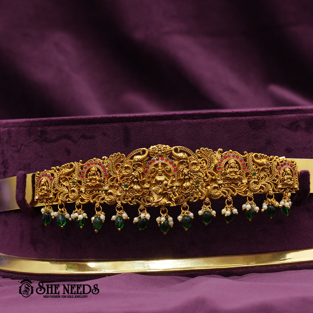 This striking vaddanam (waist belt) showcases a grand temple design, with a detailed central Lakshmi motif surrounded by traditional miniature sculptures, intricate filigree, and accents of red and green stones. The lower edge is adorned with strings of green bead hangings and pearl clusters, lending festive color and movement. Ideal for bridal, classical dance, and temple occasions.